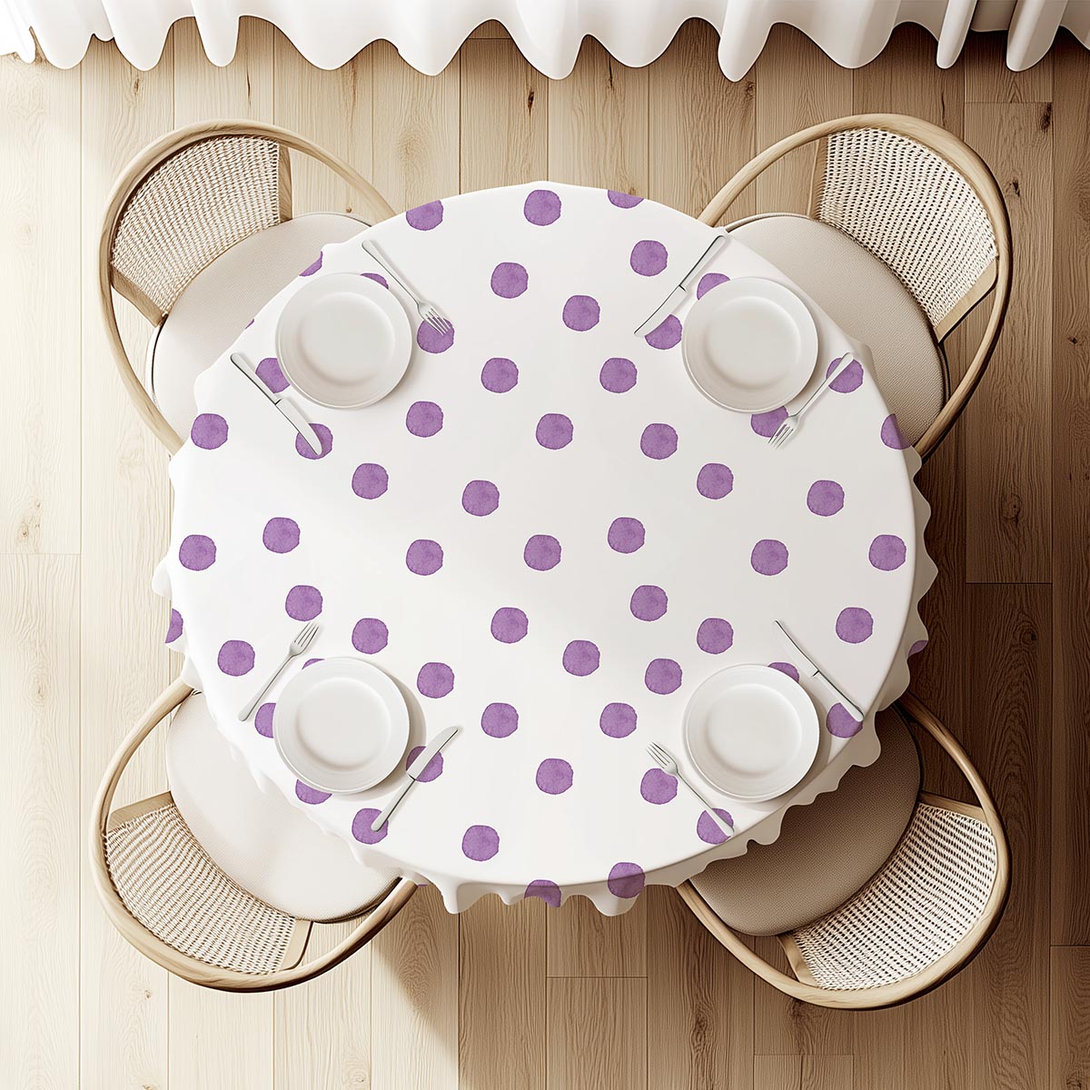 Delikatny wzór luźnych, fioletowych kropek nadaje stołowi lekkości i przytulnego charakteru. Obrus świetnie sprawdzi się zarówno na co dzień, jak i podczas spotkań z bliskimi, wprowadzając subtelny, artystyczny akcent.