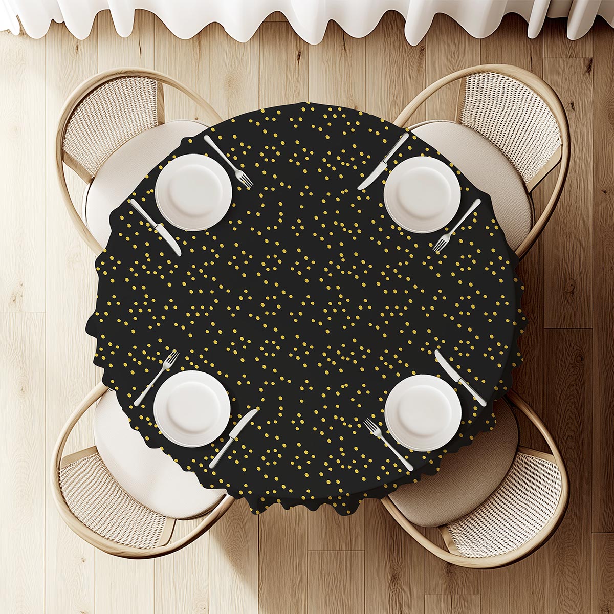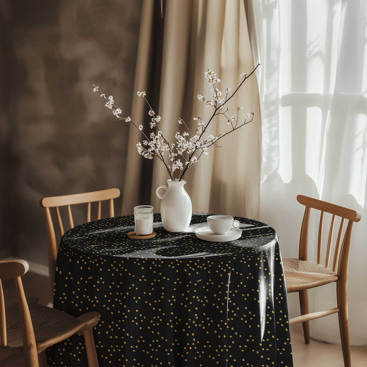 Czarny obrus ozdobiony nieregularnymi, drobnymi złotymi kropkami tworzy efekt subtelnego konfetti, który stonuje wnętrze i dodaje mu elegancji. Wzór jest dyskretny, a jednocześnie zauważalny — idealny, gdy chcesz wprowadzić szyk bez przesadnej pompatyczności.