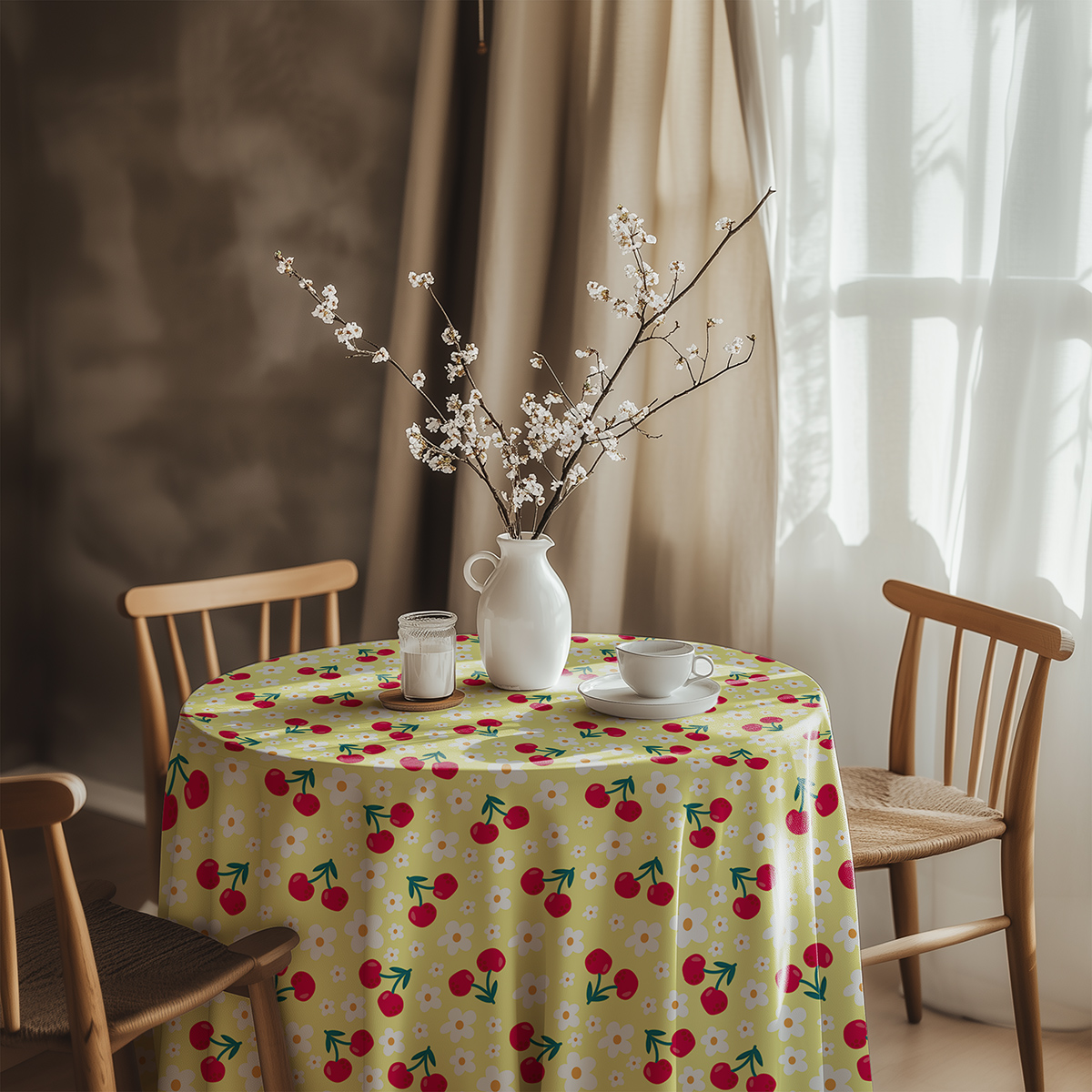 Radosny wzór drobnych czerwonych wiśni przeplatanych białymi stokrotkami na ciepłym żółtym tle dodaje stołowi przyjemnej świeżości i letniego charakteru. Projekt jest lekki i dekoracyjny, idealny gdy chcesz w prosty sposób ożywić kuchnię lub jadalnię.