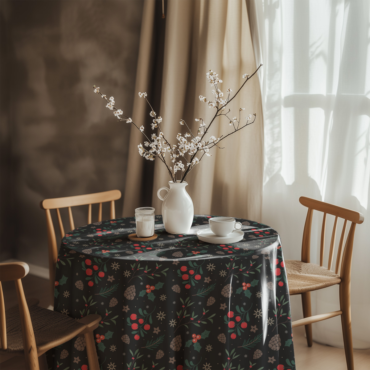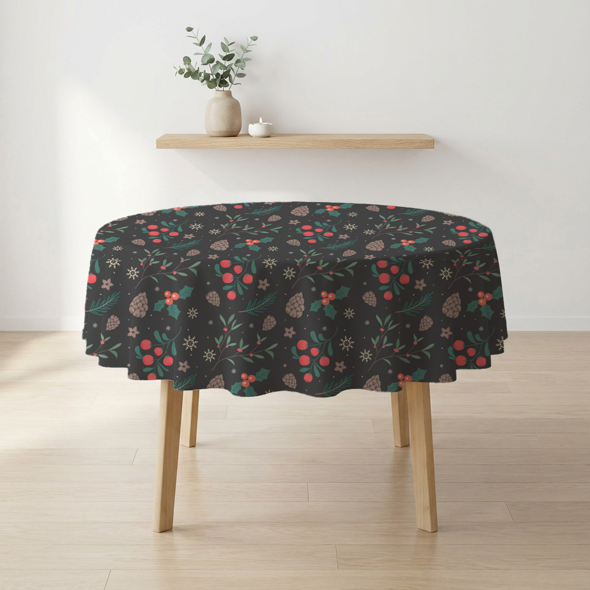 Elegancki okrągły obrus świąteczny szyty na wymiar, w czarnym kolorze z subtelnym wzorem zimowych gałązek, szyszek i czerwonych owoców. Stylowy, wyrazisty i idealny do świątecznych aranżacji stołu w jadalni lub kuchni. Doskonale podkreśla okrągły kształt stołu i tworzy wyjątkowy klimat zimowego sezonu.
