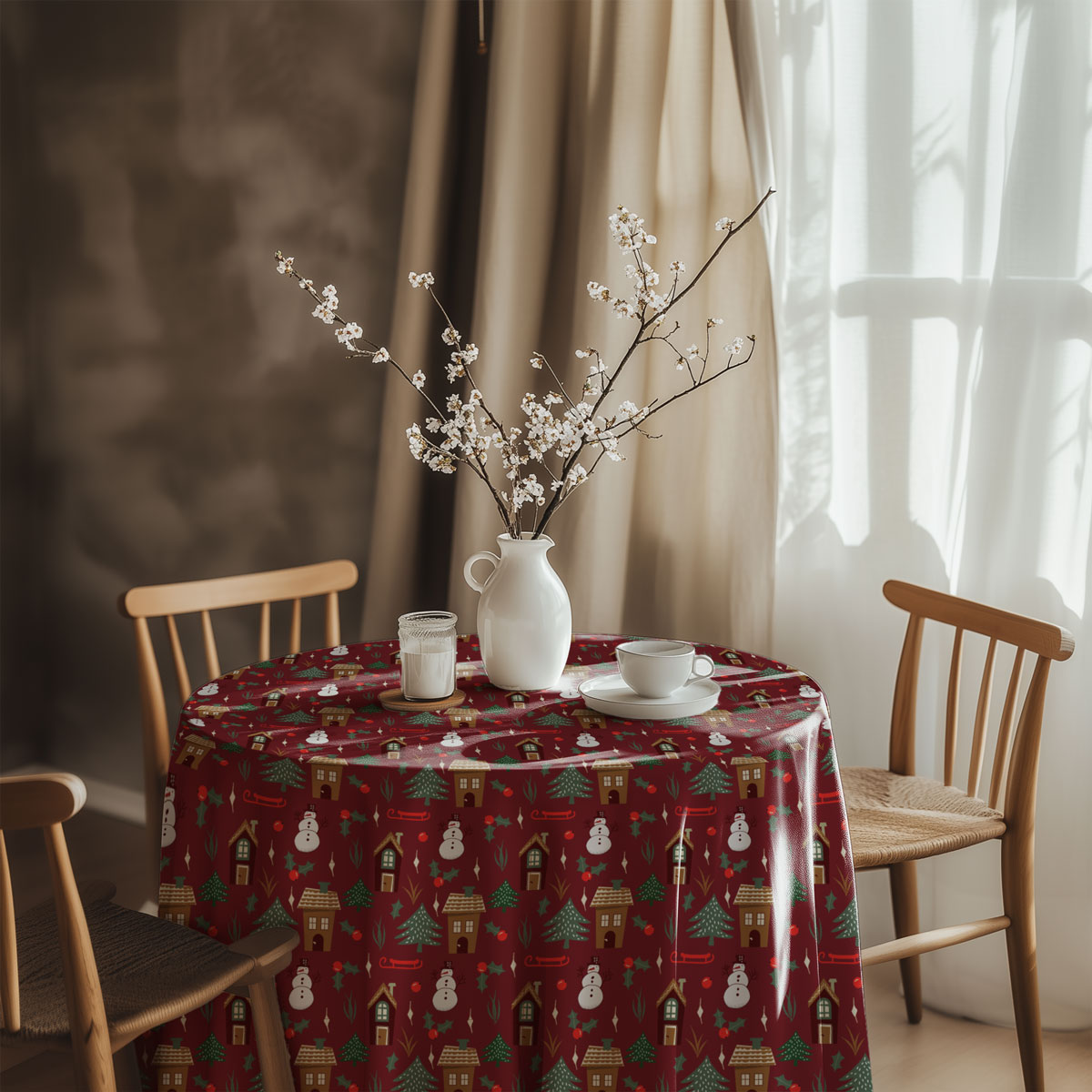 Wyraziste bordowe tło oraz dekoracyjny zimowy wzór – domki, bałwanki, choinki, ostrokrzew, sanki – tworzą ciepły, przytulny klimat. Motyw jest wyrazisty, ale jednocześnie elegancki, dzięki czemu obrus pasuje zarówno do wnętrz tradycyjnych, jak i nowoczesnych.