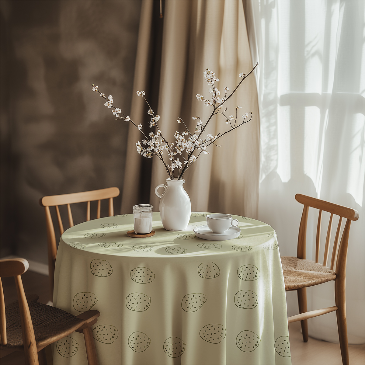 Ten obrus łączy prostotę formy z subtelnym, ręcznie rysowanym wzorem okręgów wypełnionych drobnymi kropeczkami, co daje lekko artystyczny, ale jednocześnie uporządkowany efekt. Delikatna paleta i nieregularne kontury nadają mu przytulny charakter, który pasuje do nowoczesnych i skandynawskich wnętrz.