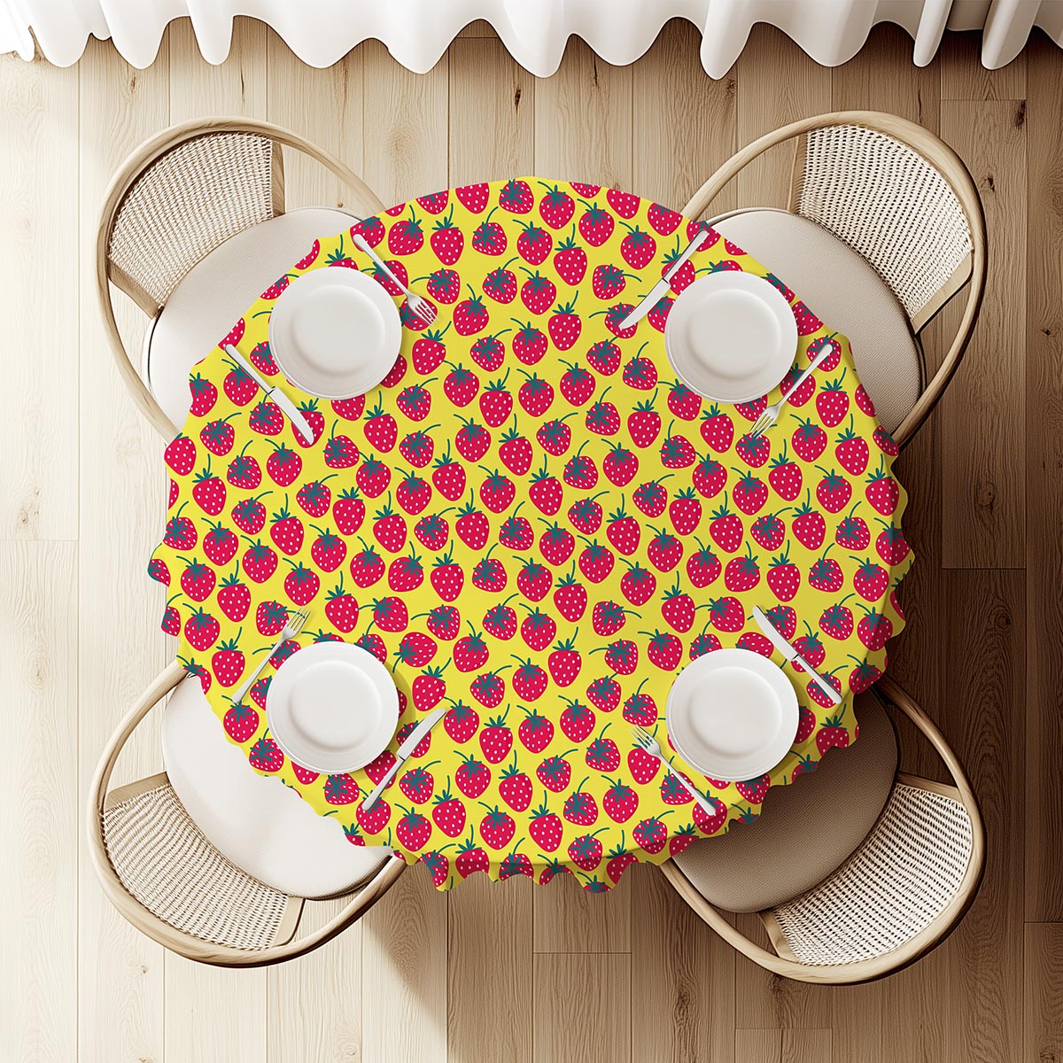Ten okrągły obrus przyciąga wzrok żywymi, czerwonymi truskawkami rozmieszczonymi na ciepłym, żółtym tle. Wzór jest radosny i nieformalny, idealny do kuchni, jadalni oraz na letnie spotkania przy stole, gdzie chce się stworzyć przyjazną, pogodną atmosferę.