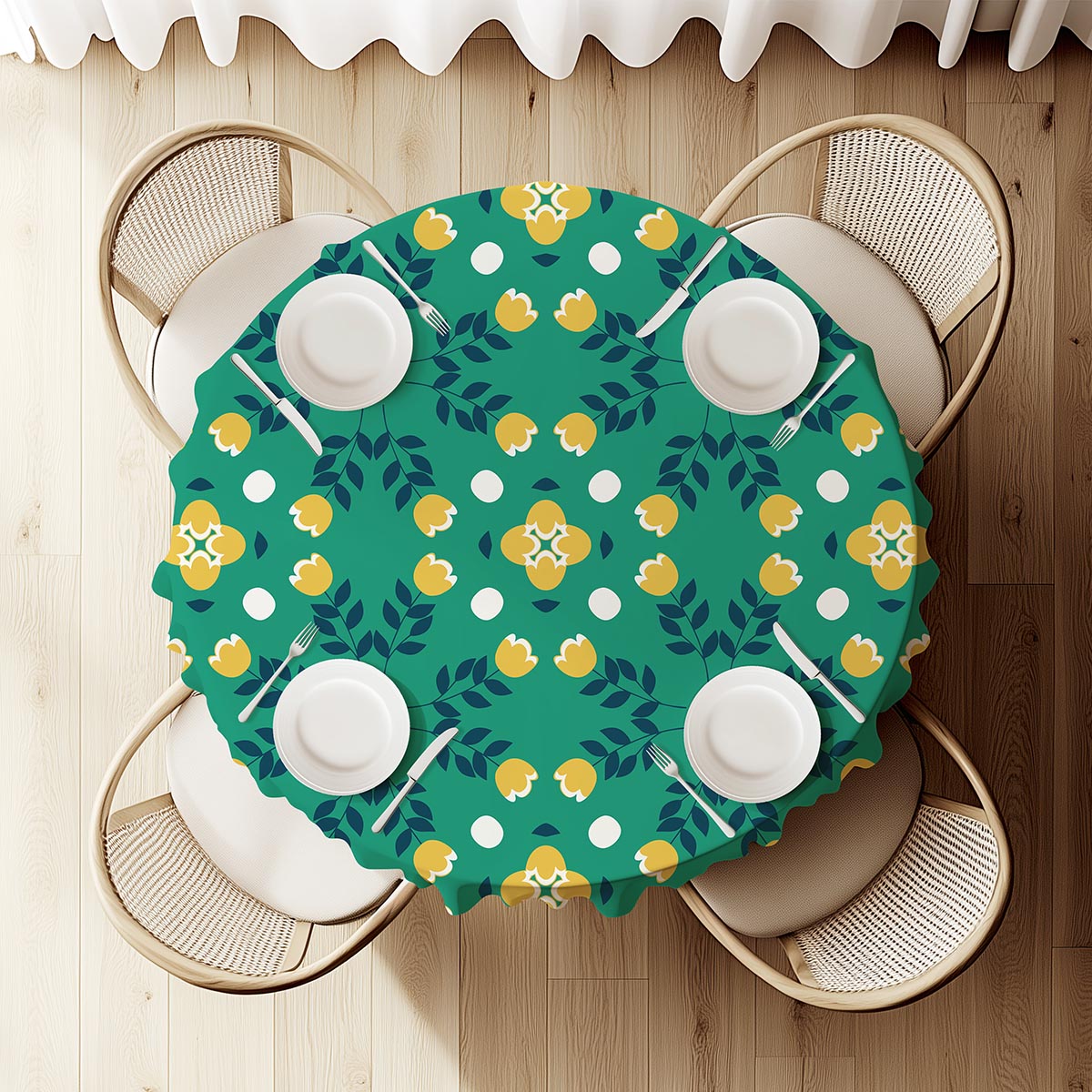 Wzór łączy intensywną zieleń tła z rytmicznie rozmieszczonymi żółtymi kwiatami i subtelnymi, granatowymi listkami. Białe kropki wkomponowane w kompozycję wprowadzają lekkość i nowoczesny akcent, dzięki czemu obrus jest zarówno dekoracyjny, jak i przyjemny dla oka.