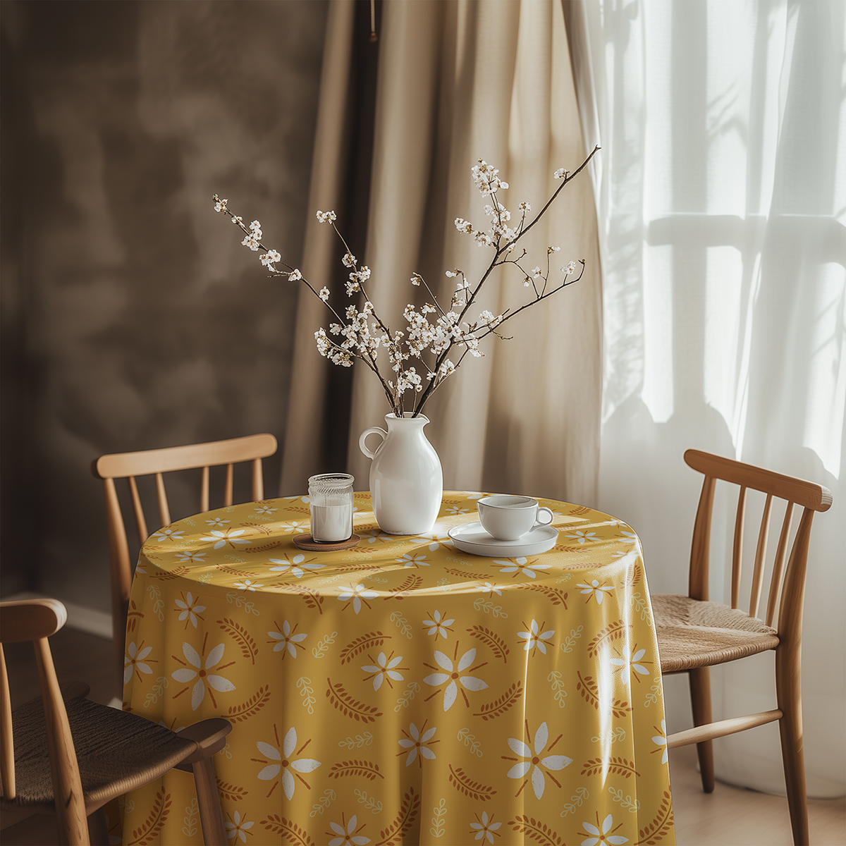 Ten obrus przyciąga spojrzenia delikatnym, ręcznie rysowanym wzorem białych kwiatów na musztardowym tle, uzupełnionym subtelnymi listkami. Kompozycja tworzy ciepły, naturalny klimat, który sprawdzi się w kuchni, jadalni czy na tarasie przez cały rok.