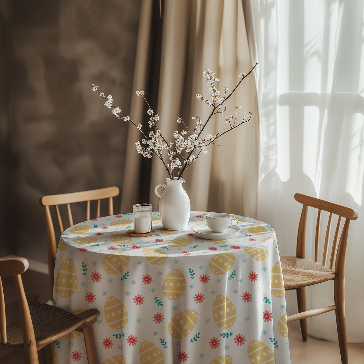 Świąteczny okrągły obrus z motywem pisanek i delikatnych wiosennych kwiatów w subtelnych, pastelowych barwach. Doda stołowi przytulnego, sezonowego charakteru podczas rodzinnych spotkań i porannych kaw.