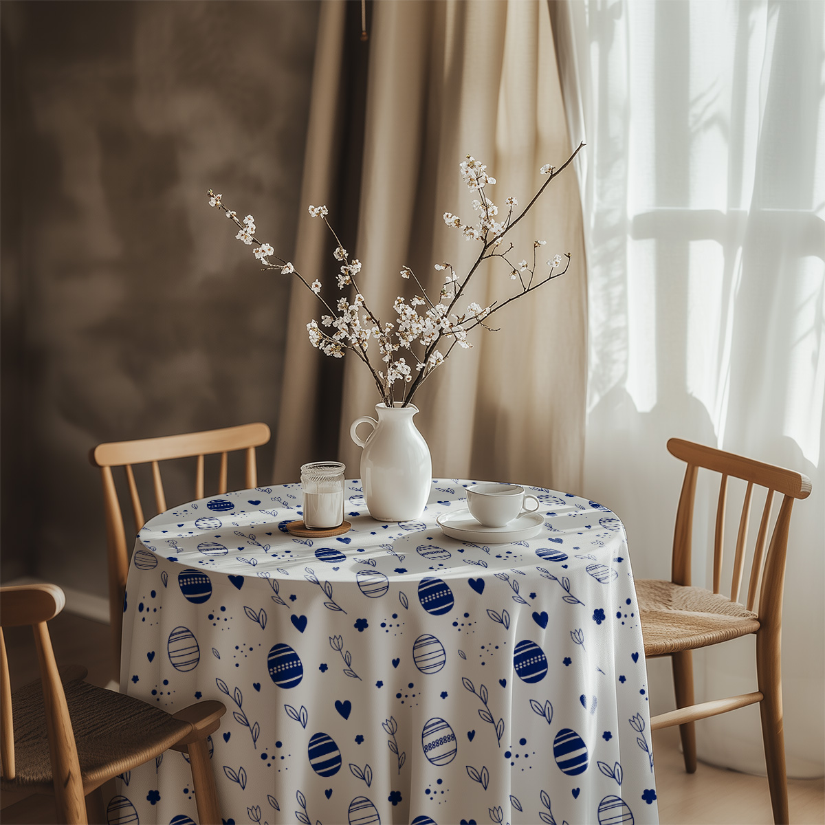 Świąteczny obrus w delikatny wzór z pisankami i gałązkami doda stołowi lekkiego, wiosennego charakteru. Uniwersalna biel z granatowymi motywami sprawdzi się zarówno przy codziennych śniadaniach, jak i podczas rodzinnych spotkań.