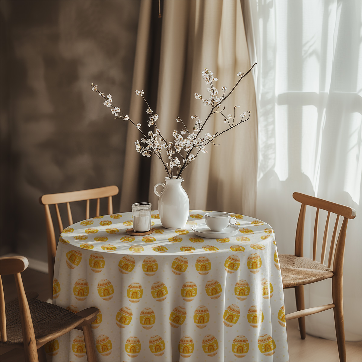 Połącz obrus z prostymi, neutralnymi dodatkami — wazonem z gałązkami, jasną zastawą i naturalnymi krzesłami — aby uzyskać spójny, wiosenny wygląd stołu. To uniwersalny element dekoracyjny, który doda ciepła i świątecznego nastroju każdemu wnętrzu.