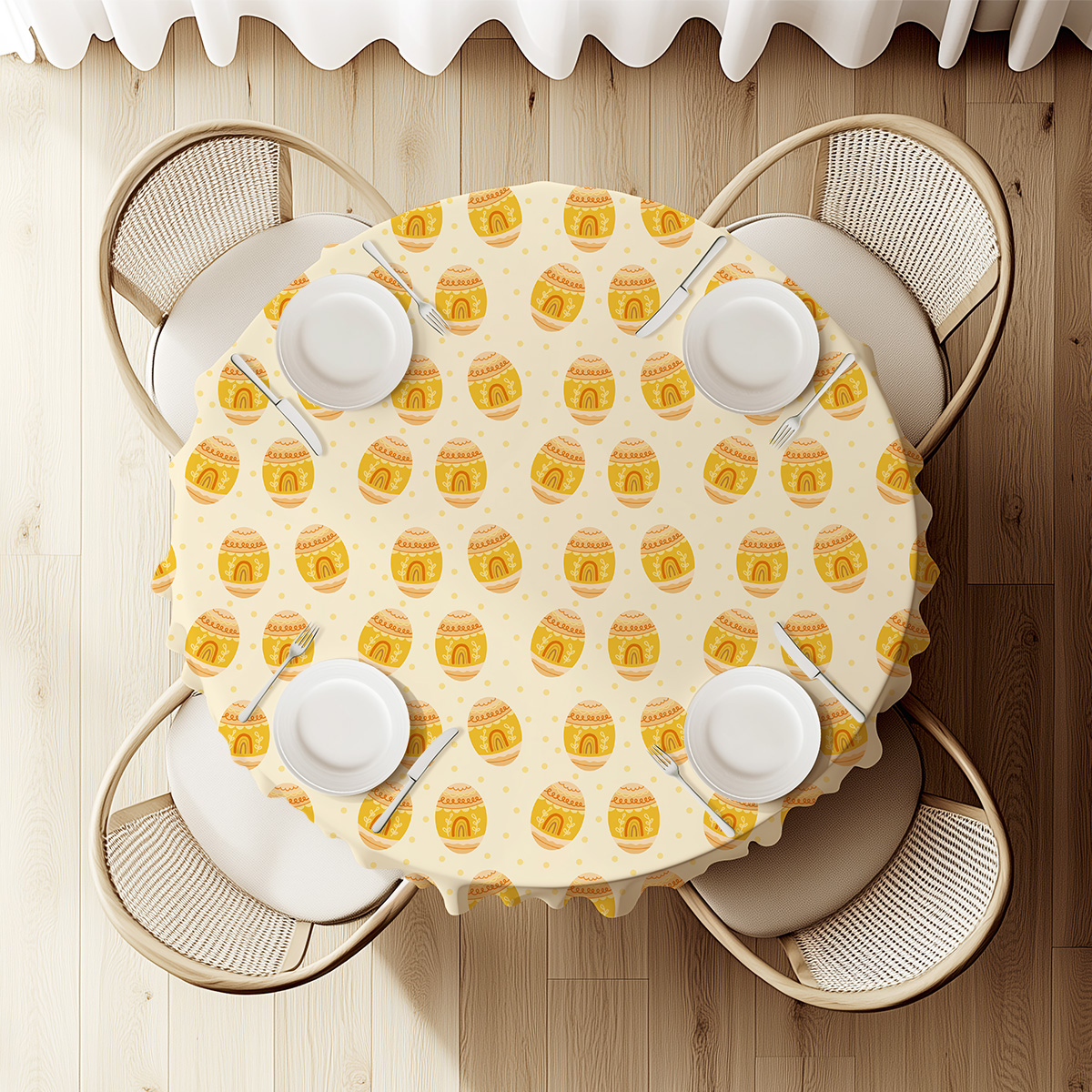 Ten okrągły obrus prezentuje wzór wesołych, ręcznie rysowanych pisanek w odcieniach żółci na jasnym, kremowym tle. Motyw jest lekki i przyjazny, dzięki czemu wnętrze nabiera świątecznego, a zarazem przytulnego charakteru.