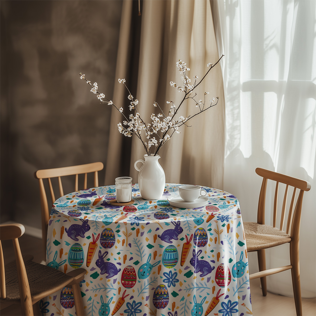 Okrągły obrus z wesołym motywem zajączków i pisanek doda świątecznego charakteru każdemu stołowi. Kolorowy wzór z marchewkami i kwiatami wprowadzi radosną atmosferę podczas wielkanocnych spotkań.