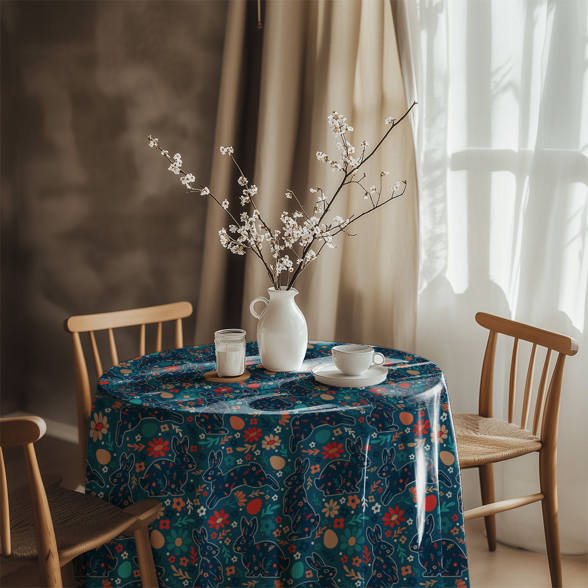 Uroczy okrągły obrus z wzorem zajączków, pisanek i drobnych kwiatów doda świątecznej lekkości każdemu stołowi. Intensywne granatowe tło z akcentami koralu, turkusu i beżu tworzy przytulny, stylowy klimat.