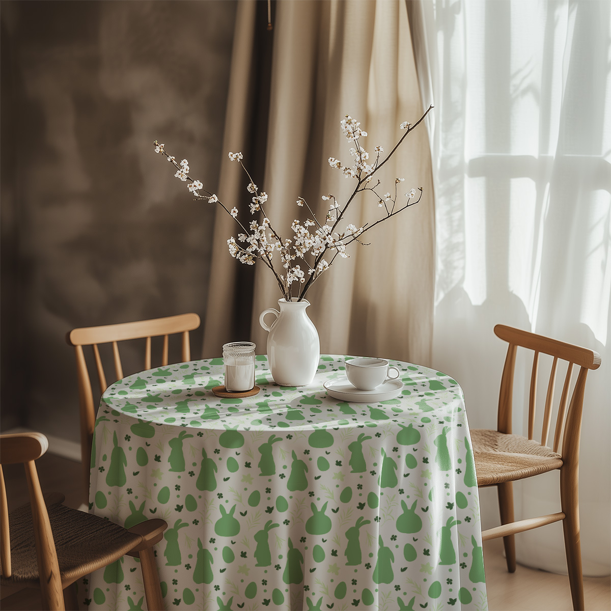 Świąteczny obrus z motywem zajączków i pisanek w odcieniach zieleni wnosi świeży, wiosenny akcent do stołu. Kremowe tło i subtelny wzór tworzą przytulną oprawę zarówno na rodzinne śniadanie, jak i bardziej uroczyste spotkanie.