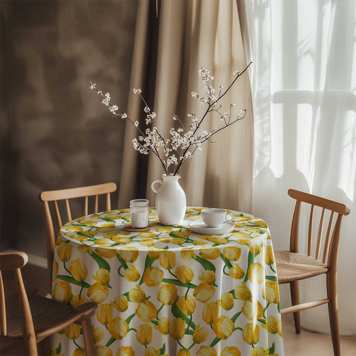 Wzór pełen żółtych tulipanów rozświetla białe tło, tworząc radosny i lekki akcent na stole. Intensywne odcienie żółci w połączeniu z zielonymi łodygami wprowadzają energię i optymizm do wnętrza.