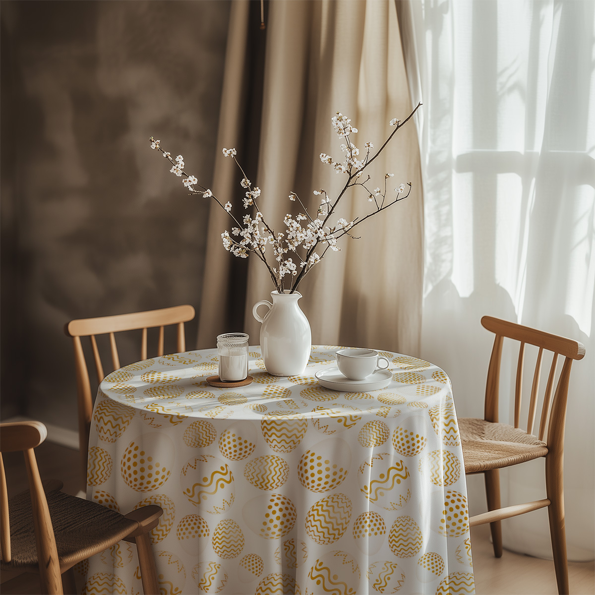 Wielkanocny obrus z delikatnym wzorem złotych pisanek doda stołowi elegancji podczas świąt. Miękka tkanina jest łatwa w utrzymaniu czystości i sprawdzi się zarówno przy odświętnych, jak i codziennych aranżacjach.