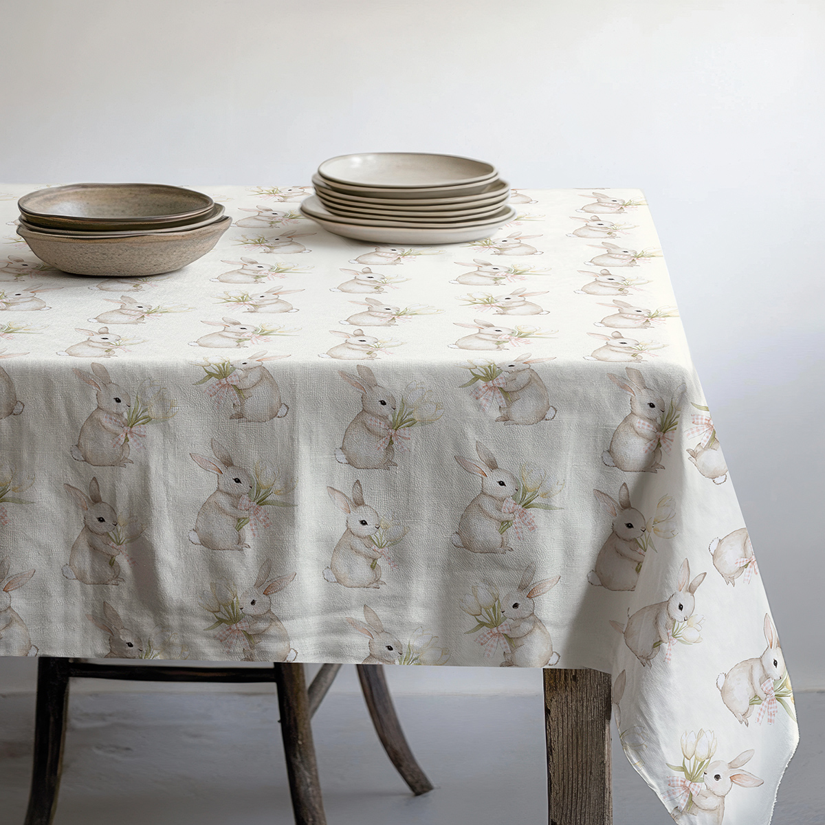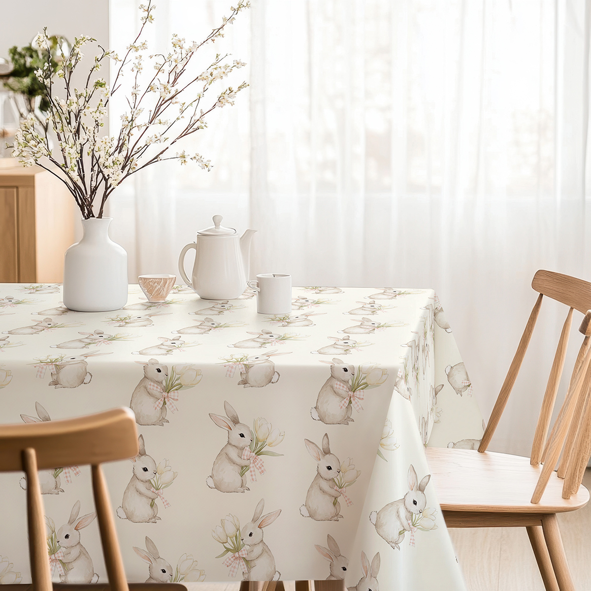 Ten obrus łączy subtelność akwarelowego wzoru z praktycznym zastosowaniem — urocze zajączki trzymające bukieciki tulipanów tworzą delikatny, świąteczny motyw idealny na wielkanocny stół. Świąteczny charakter materiału podkreślają pastelowe akcenty i drobne detale, które wprowadzają przytulną atmosferę podczas świątecznych spotkań. Tkanina prezentuje się elegancko zarówno w codziennym użytku, jak i przy odświętnych nakryciach; obrus łatwo stylizować z porcelaną i prostymi dekoracjami, tworząc spójną, świąteczną aranżację.