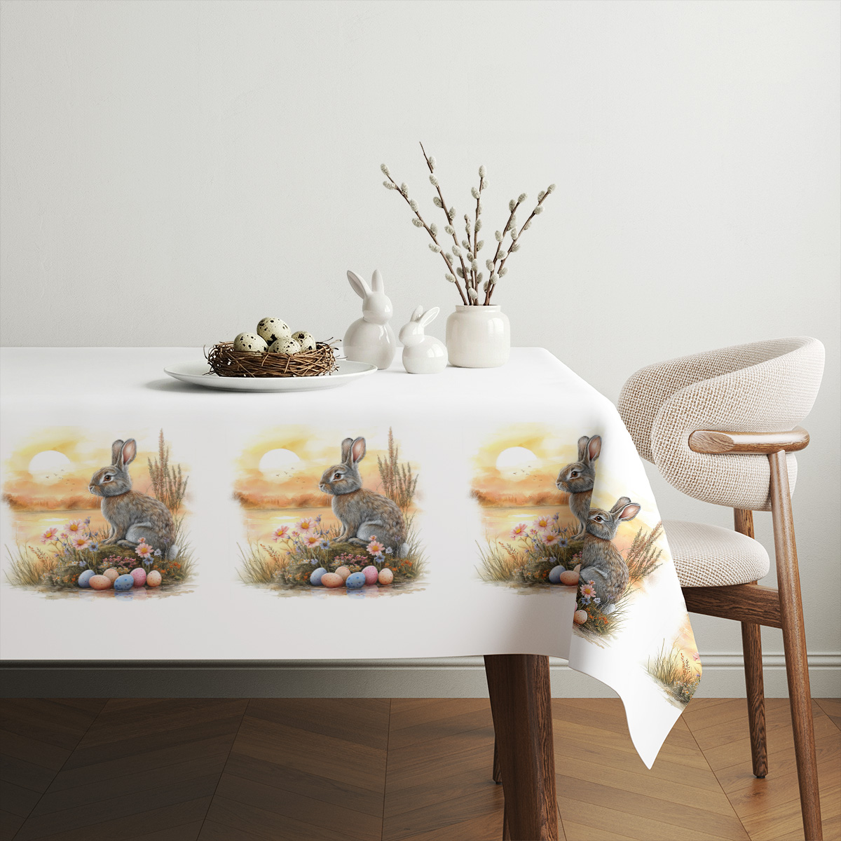 Dekoracyjny wielkanocny obrus plamoodporny na wymiar – zajączek o poranku i pisanki