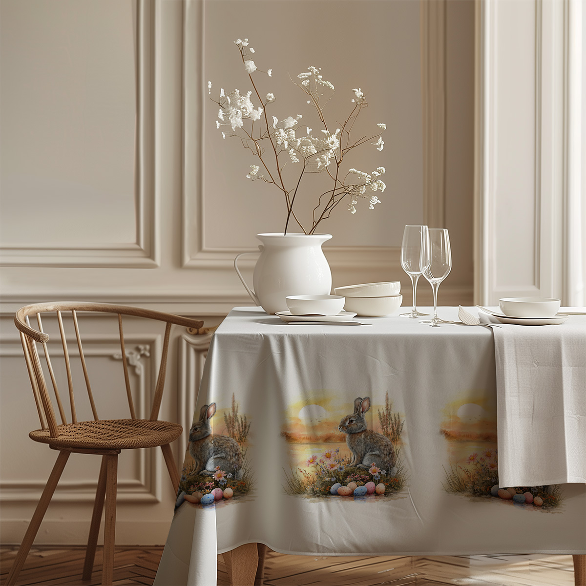 Miękki, malarski wzór przedstawia zajączka na tle wschodzącego słońca, pachnących łąk i kolorowych pisanek — idealny jako dekoracja świątecznego stołu. Delikatne akwarelowe barwy tworzą przytulny nastrój, który podkreśli świąteczne aranżacje.