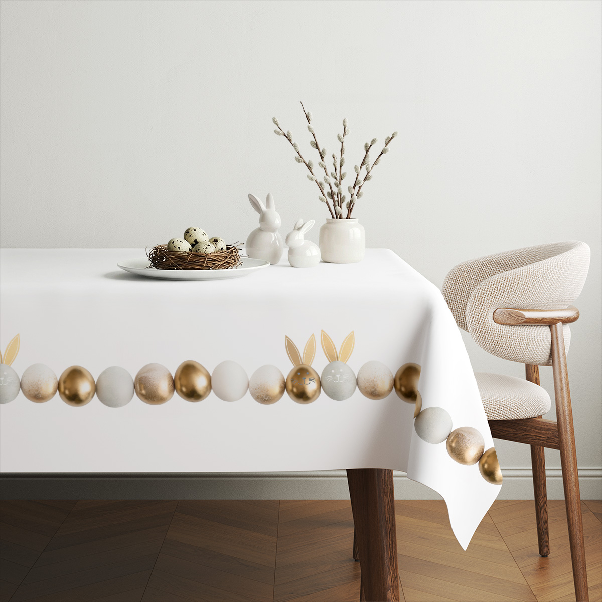 Świąteczny obrus udekoruje stół delikatnym paskiem złotych pisanek i uroczymi motywami króliczka. Elegancki i stonowany wzór wprowadzi świąteczną atmosferę do każdego wnętrza.