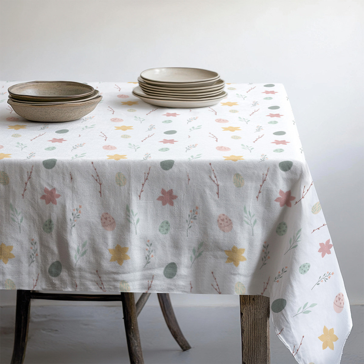 Ten elegancki obrus wielkanocny na wymiar wyróżnia się jasną, białą tkaniną oraz subtelnym wzorem pastelowych pisanek, delikatnych kwiatów i wiosennych gałązek. To harmonijna dekoracja, która wprowadza do wnętrza lekkość, świeżość i świąteczny klimat Wielkanocy.