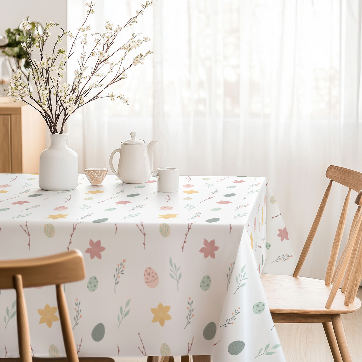 Pastelowe pisanki, drobne kwiaty i wiosenne motywy roślinne tworzą spokojną, estetyczną kompozycję. Jasna kolorystyka sprawia, że obrus idealnie nadaje się do jadalni, kuchni oraz salonu, podkreślając świąteczny, ale nienachalny charakter wnętrza.