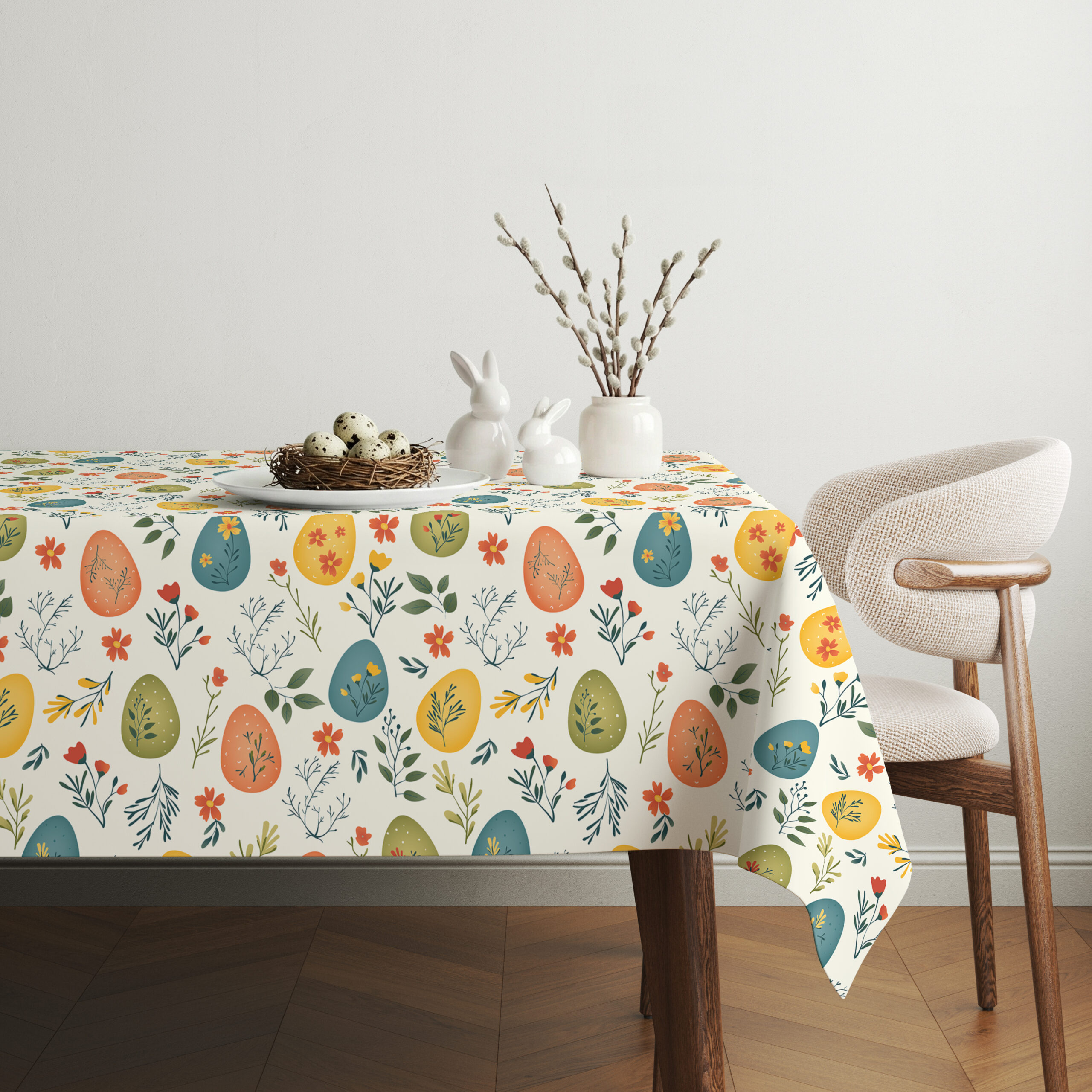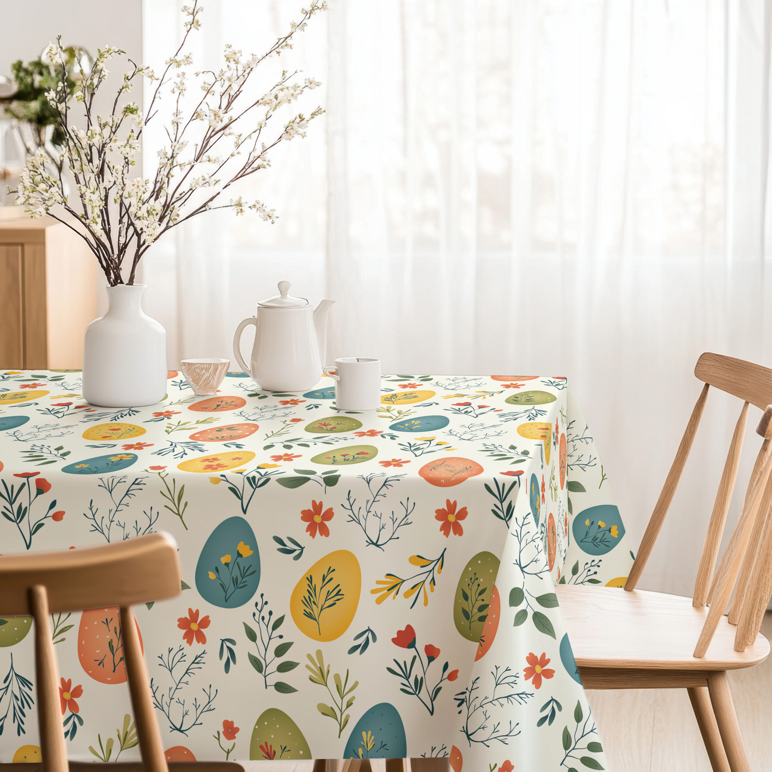 Motyw pisanek połączonych z kwiatami i roślinnymi akcentami tworzy lekką, wiosenną kompozycję. Wzór nie dominuje stołu, lecz subtelnie go zdobi, dzięki czemu obrus świetnie sprawdzi się zarówno podczas uroczystego śniadania wielkanocnego, jak i codziennych spotkań w wiosennym sezonie.