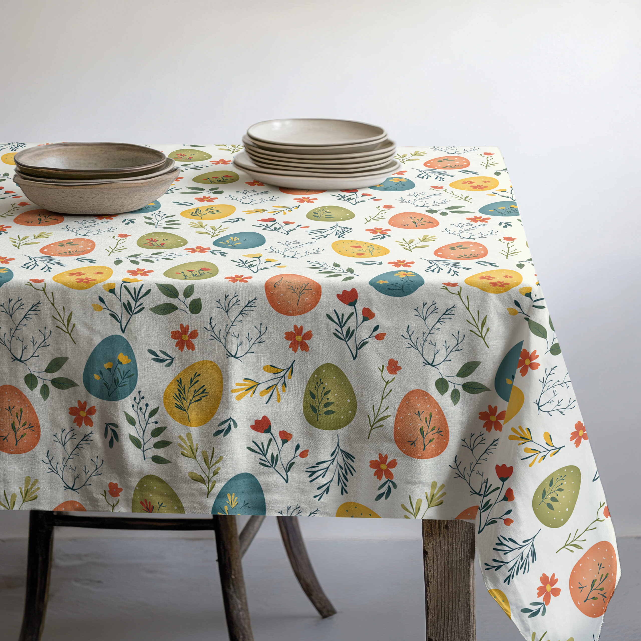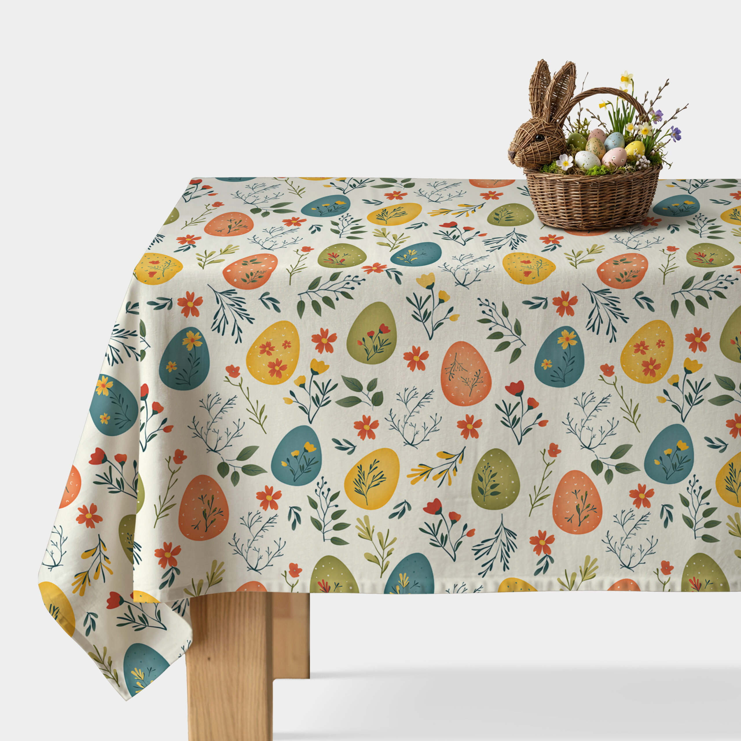 Stylowy obrus wielkanocny na wymiar w jasnym, wiosennym wzorze pisanek i delikatnych kwiatów. Subtelna kolorystyka i dekoracyjny motyw pięknie podkreślają świąteczny stół, tworząc lekką i radosną aranżację na Wielkanoc.