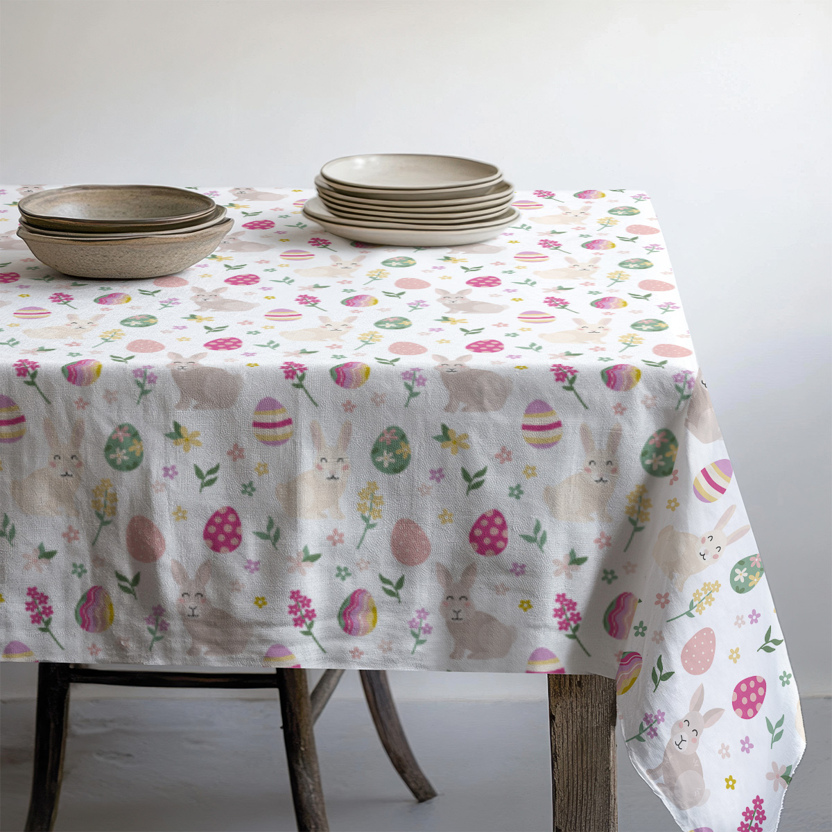 Ten obrus prezentuje sympatyczne, rysunkowe króliczki oraz kolorowe pisanki rozrzucone na jasnym tle, co tworzy lekki i radosny motyw idealny na Wielkanoc i wiosenne spotkania. Pastelowe odcienie różu, zieleni i żółci nadają mu subtelny charakter, który nie przytłacza wnętrza.