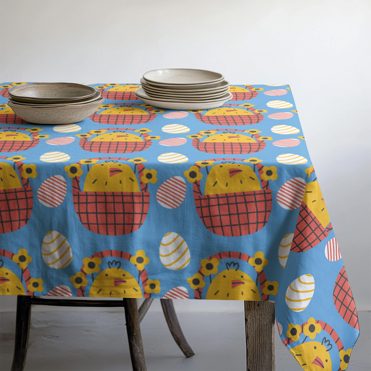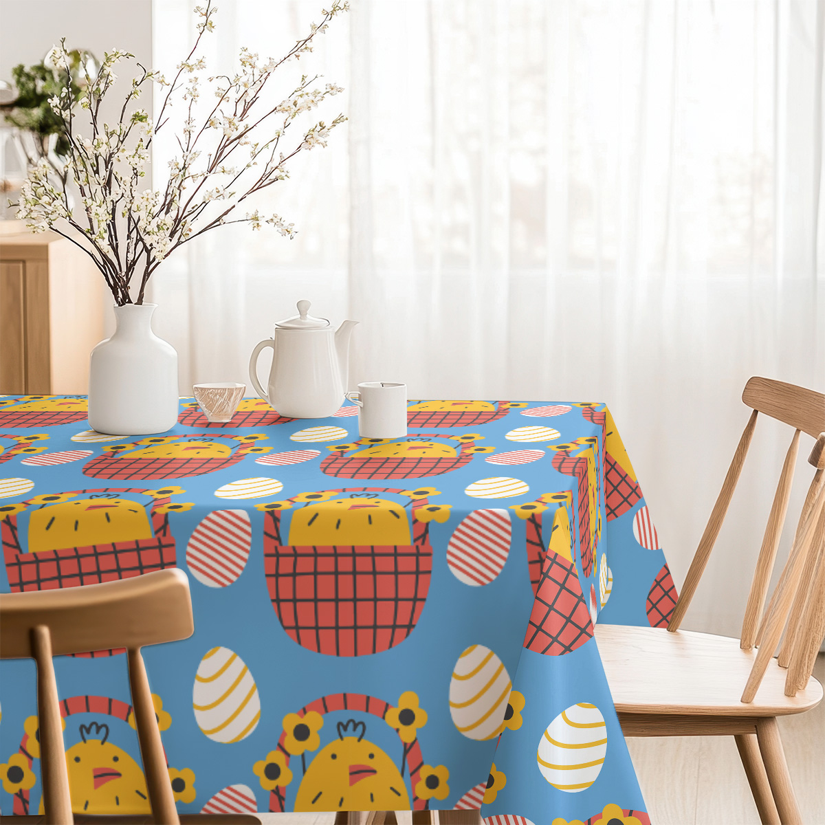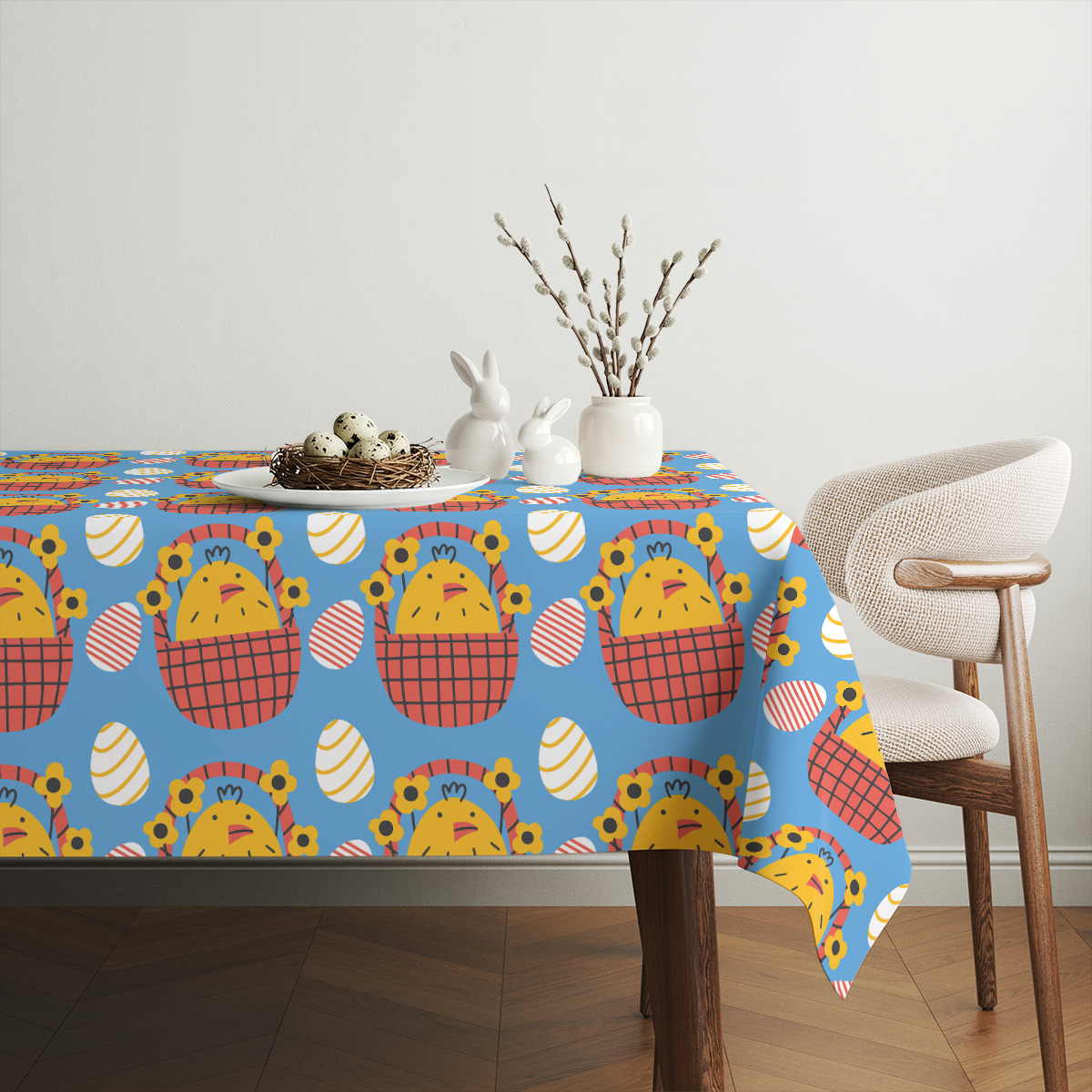 Wzór sprawdzi się zarówno podczas wielkanocnych śniadań, jak i codziennych spotkań rodzinnych; ożywi neutralne wnętrza i podkreśli świąteczną atmosferę. Obrus dobrze komponuje się z prostą zastawą stołową oraz naturalnymi dodatkami.