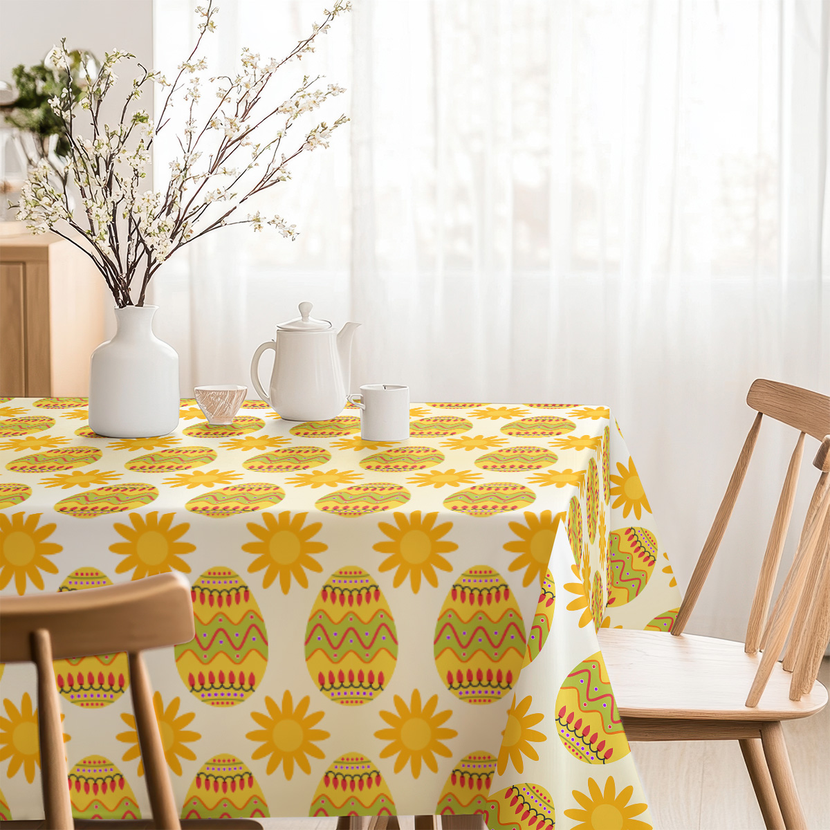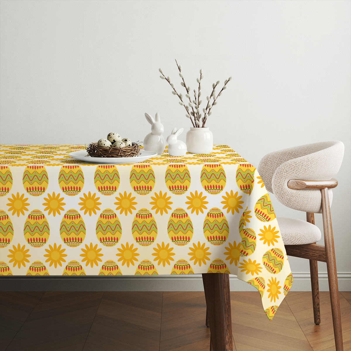 Radosny wzór łączy kolorowe pisanki z promiennymi, żółtymi kwiatuszkami, tworząc pogodną kompozycję idealną na świąteczny stół. Delikatne tło podkreśla intensywność żółci i ciepłe akcenty, dzięki czemu obrus pasuje do klasycznych i nowoczesnych aranżacji. Sprawdzi się jako dekoracja podczas rodzinnych spotkań wielkanocnych oraz w codziennych, wiosennych zastawach stołowych. Udekoruj go prostym koszykiem z jajkami lub ceramicznymi ozdobami, by uzyskać spójny i przytulny efekt na każdym stole.
