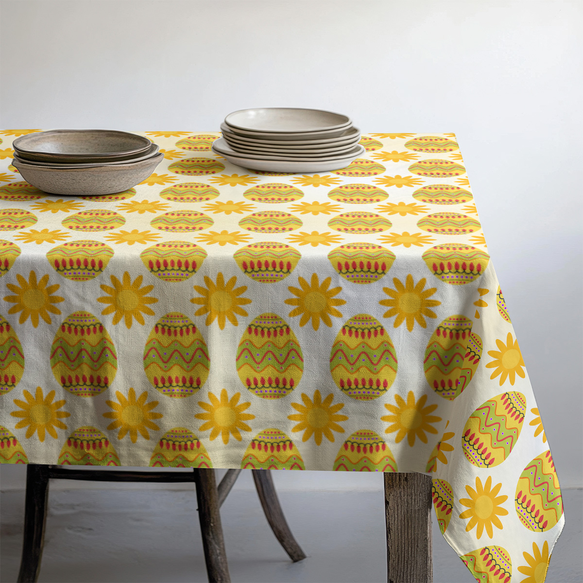 Wesoły obrus z motywem pisanek i słoneczek wprowadzi świąteczną atmosferę na każdy stół. Jasne barwy i prosty wzór podkreślają wiosenny, radosny charakter aranżacji.
