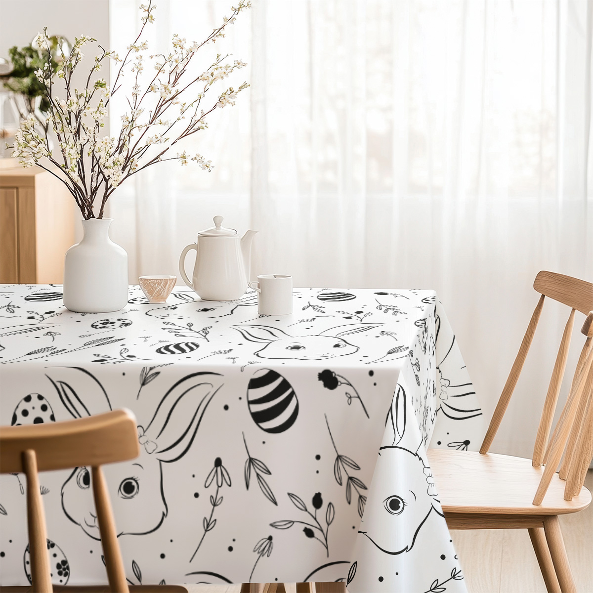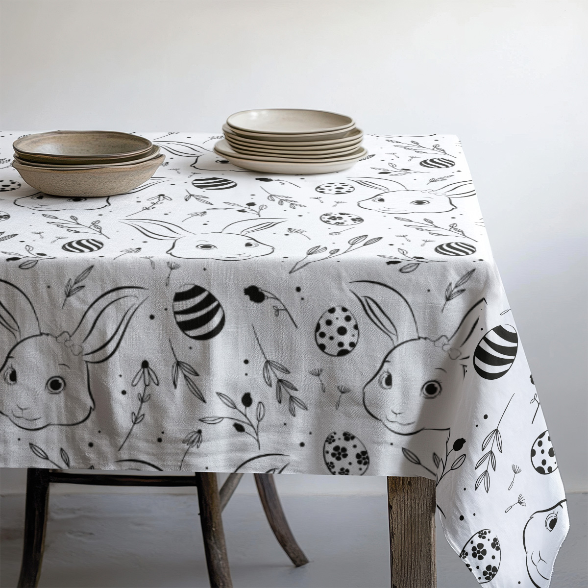 Uroczy obrus z delikatnym, ręcznie rysowanym motywem króliczków i pisanek w monochromatycznej oprawie. Subtelne elementy botaniczne podkreślają świąteczny nastrój bez przytłaczania wnętrza.