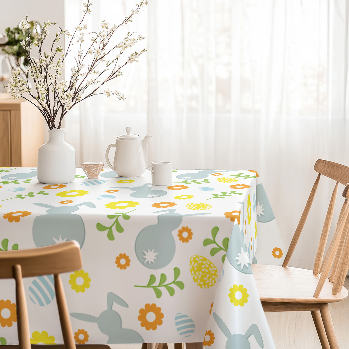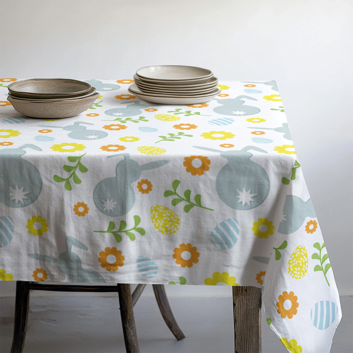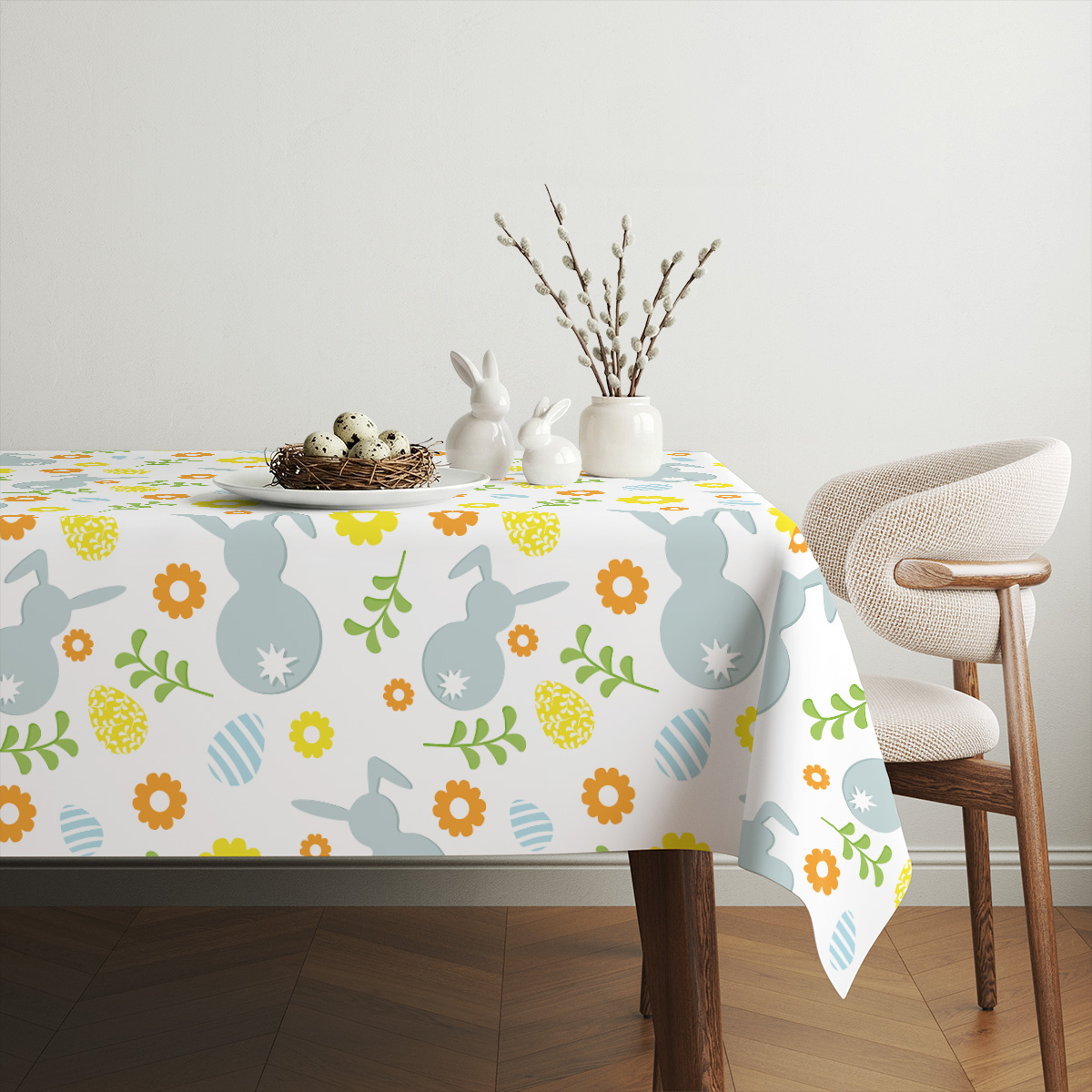 Ten obrus prezentuje powtarzający się wzór z delikatnymi sylwetkami zajączków, ozdobnymi pisankami i prostymi kwiatami w wesołych, pastelowych kolorach. Kompozycja jest lekka i pogodna, dzięki czemu stołowa aranżacja zyskuje świeży, świąteczny akcent. Wzór doskonale sprawdzi się podczas wielkanocnych spotkań rodzinnych, komponując się z naturalnymi dekoracjami takimi jak gałązki, koszyki z jajkami czy ceramiczne ozdoby. Jasne tło pozwala na łatwe łączenie z naczyniami i tekstyliami w neutralnych odcieniach. Obrus nadaje wnętrzu przytulnego i radosnego charakteru, wprowadzając wiosenną lekkość bez przytłaczania stołu. Dzięki subtelności grafiki dekoracja wygląda świeżo zarówno w codziennym, jak i świątecznym użyciu. To propozycja dla osób szukających dekoracji, która podkreśli świąteczną atmosferę i ułatwi tworzenie spójnych aranżacji stołu z naturalnymi akcentami oraz prostymi dodatkami.