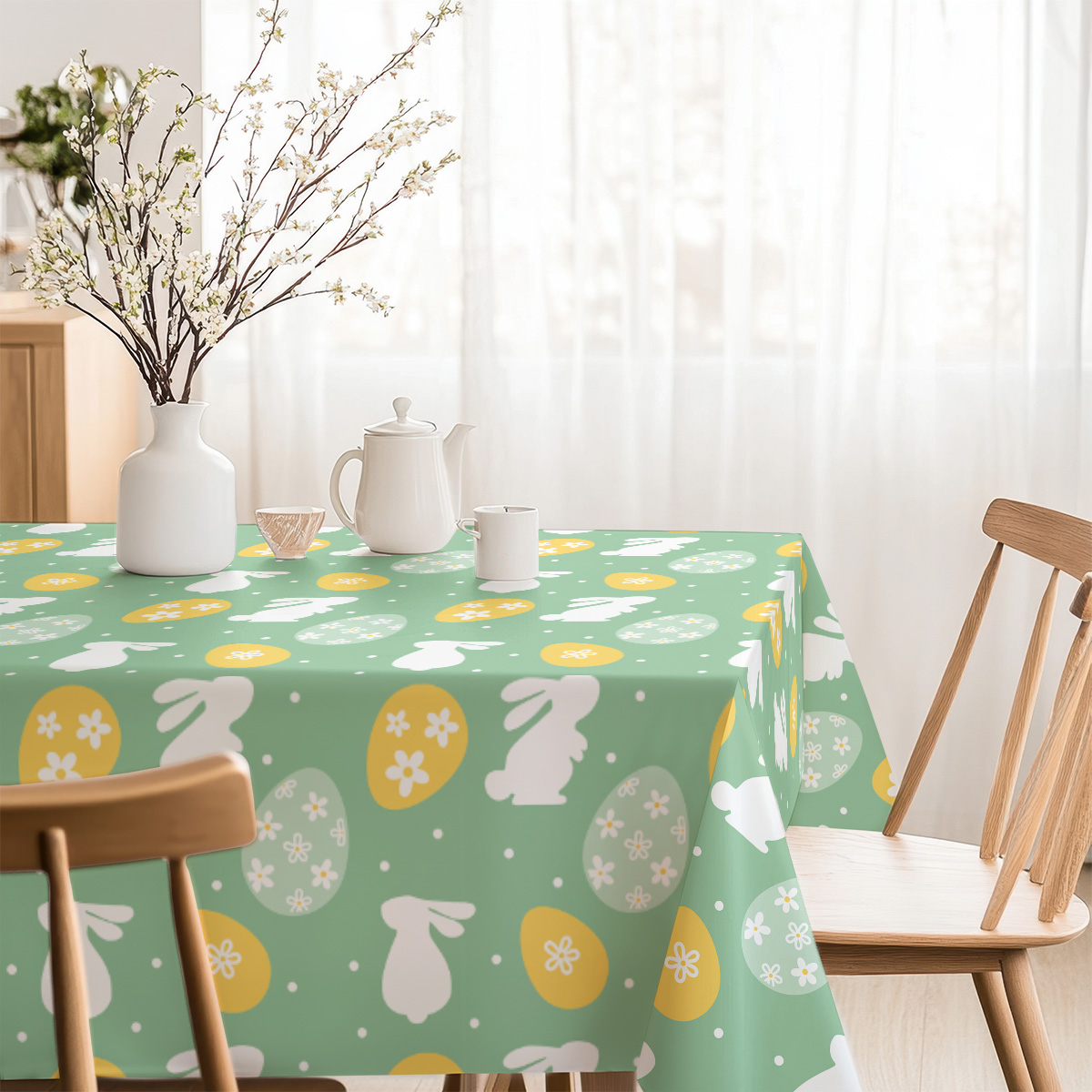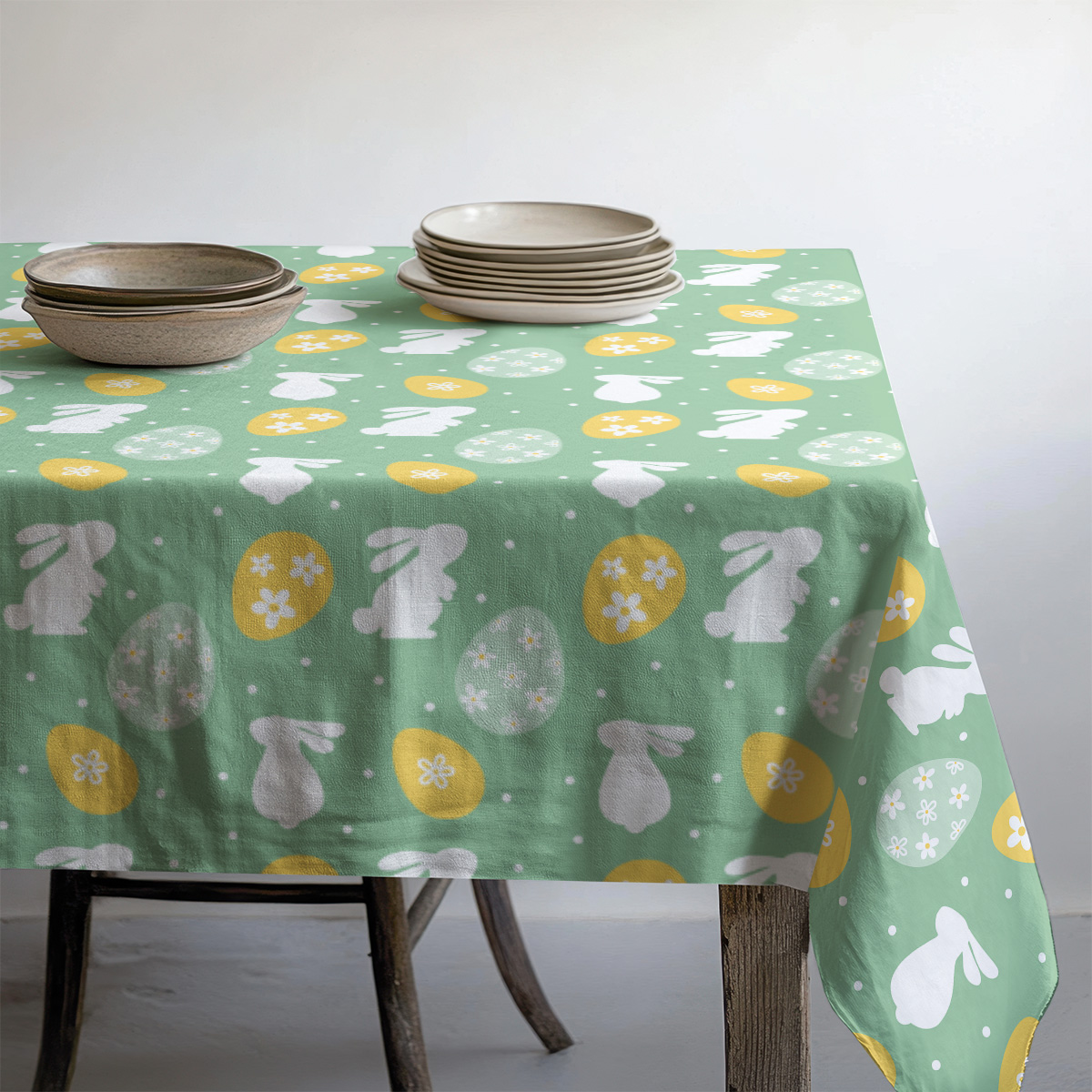 Delikatny, pastelowy wzór łączy białe sylwetki zajączków z żółtymi i jasnymi pisankami na miętowym tle, uzupełniony subtelnymi kropeczkami. Kompozycja przywodzi na myśl radosną, wiosenną atmosferę.