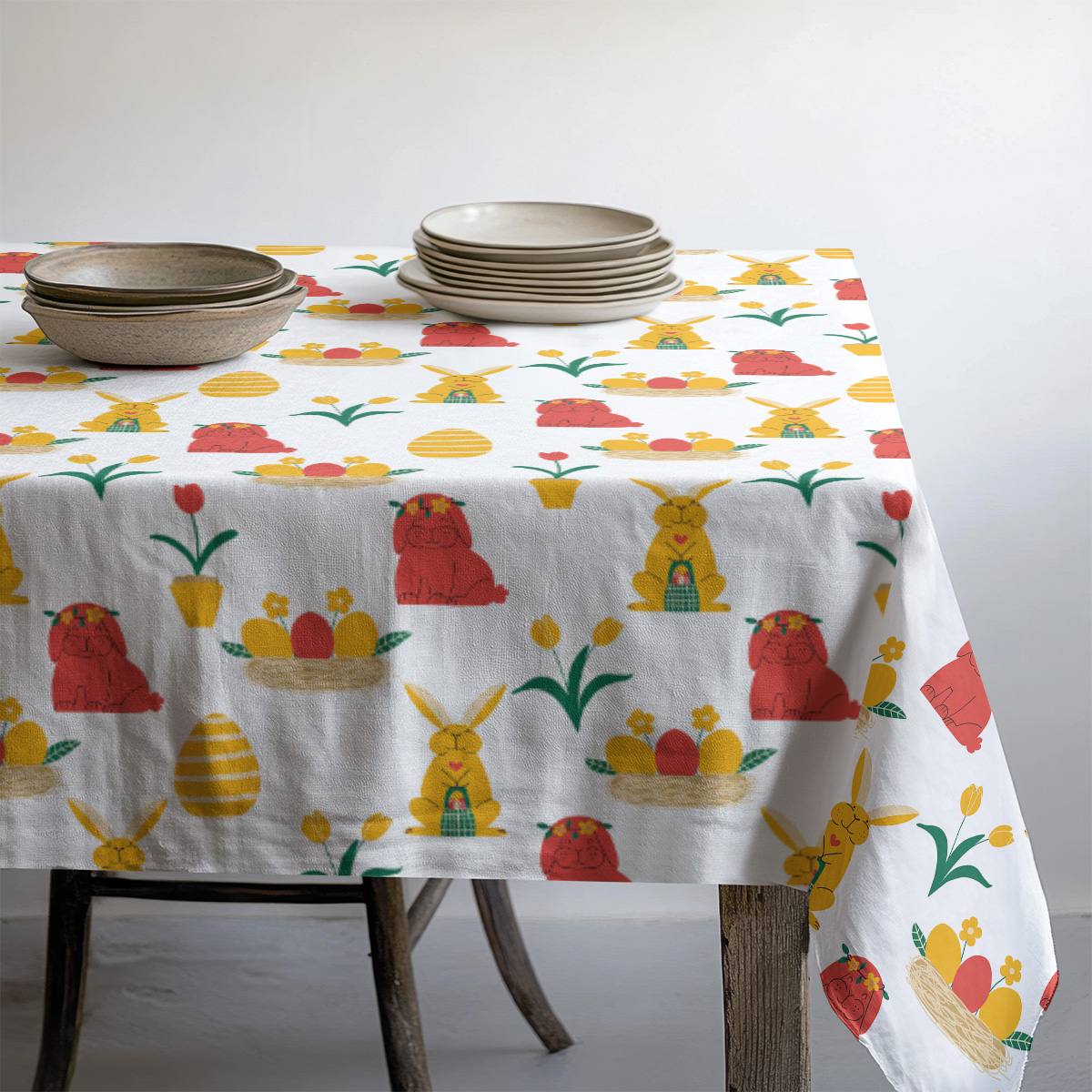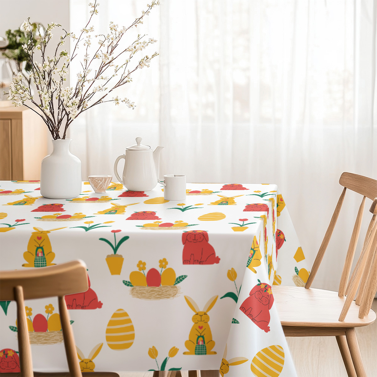 Ten wzór to świeża, wesoła oprawa stołu — białe tło podkreśla żywe żółte i czerwone motywy, które nadają aranżacji lekkości i wiosennej radości. Sympatyczne zajączki, gniazdka z pisankami i tulipany tworzą przyjazny, dekoracyjny rytm na całej powierzchni. Wzór świetnie sprawdzi się podczas świątecznych spotkań, wprowadzając ciepłą, rodziną atmosferę. Jednocześnie neutralne tło i uniwersalna paleta barw pozwalają dopasować obrus do różnych stylów zastawy i dekoracji. Detale projektu są utrzymane w prostym, ilustracyjnym stylu; motywy rozmieszczone są w powtarzającym się układzie, co zapewnia spójny wygląd niezależnie od ustawienia naczyń. Kolory i figury są czytelne i przyjemne w odbiorze, co szczególnie docenią aranżacje świąteczne i dziecięce stoły. Aby podkreślić wiosenny charakter, zestaw go z naturalnymi dodatkami — wiklinowym koszykiem, ceramicznymi dekoracjami i delikatnymi gałązkami wierzbiny. Taka kompozycja tworzy lekki, domowy klimat idealny na rodzinne śniadanie czy przyjęcie wielkanocne. Obrus wprowadza do wnętrza pogodny, przyjazny nastrój i może być prostym sposobem na odświeżenie stołu przed świętami. To dekoracja, która przyciąga wzrok i nadaje codziennym chwilom świątecznego wydźwięku.