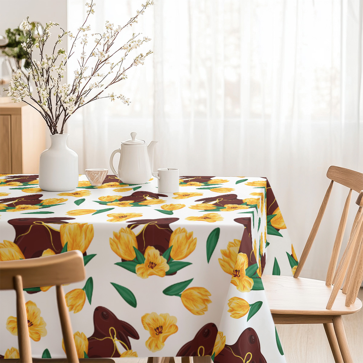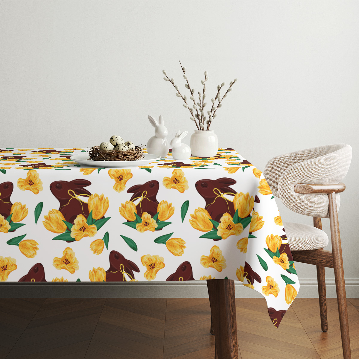 Świąteczny obrus z motywem czekoladowych zajączków i żółtych tulipanów wniesie do wnętrza radosny akcent wielkanocny. Delikatne kolory i powtarzalny wzór tworzą przytulną atmosferę przy świątecznym stole.