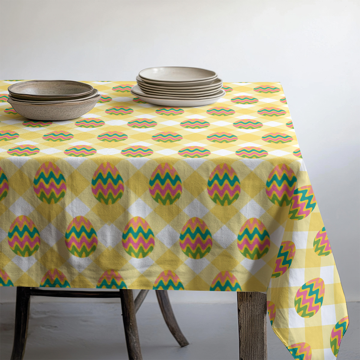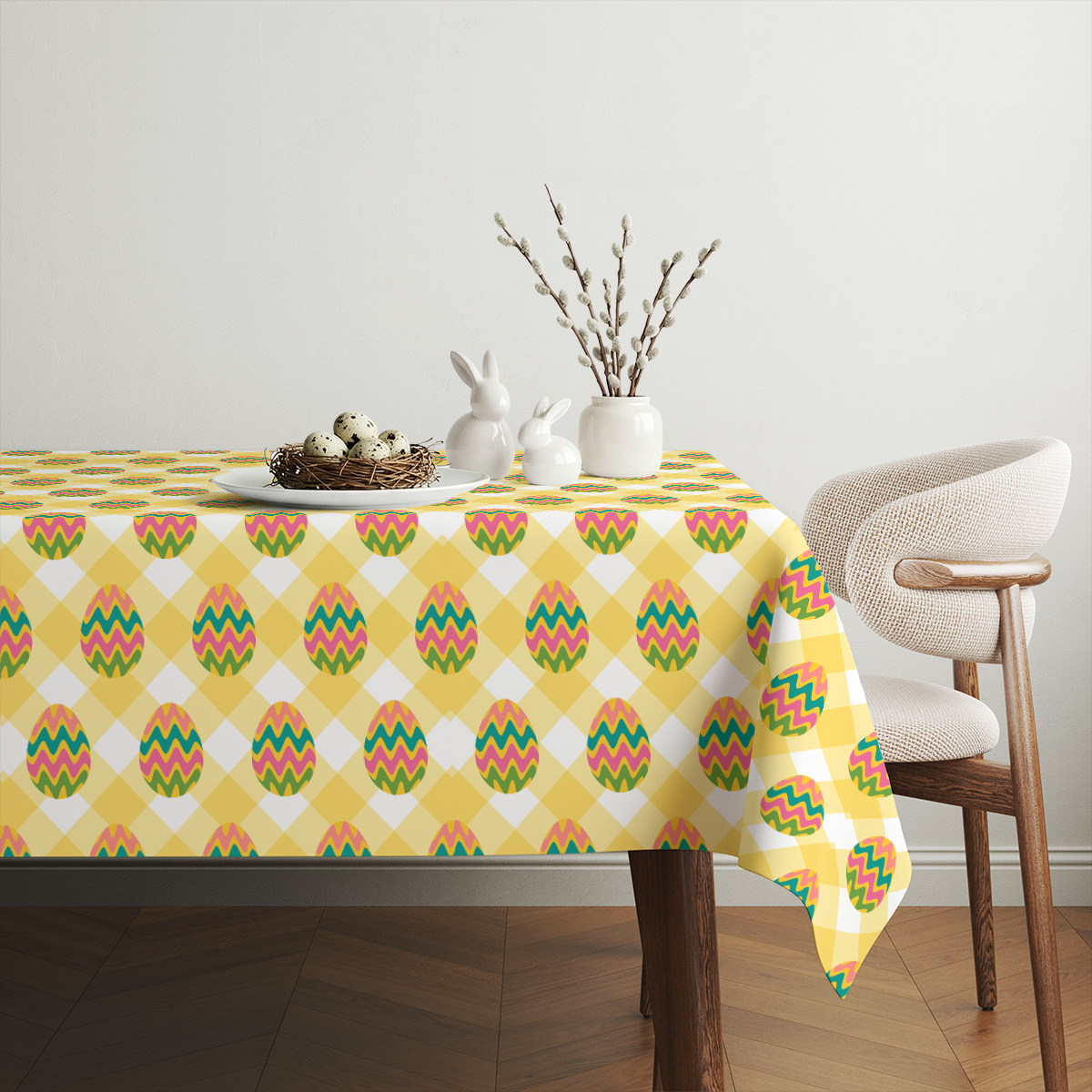 Kolorowy wzór z powtarzającymi się pisankami na jasnym, żółtym tle w kratę wnosi radosny, świąteczny akcent na każdy stół.