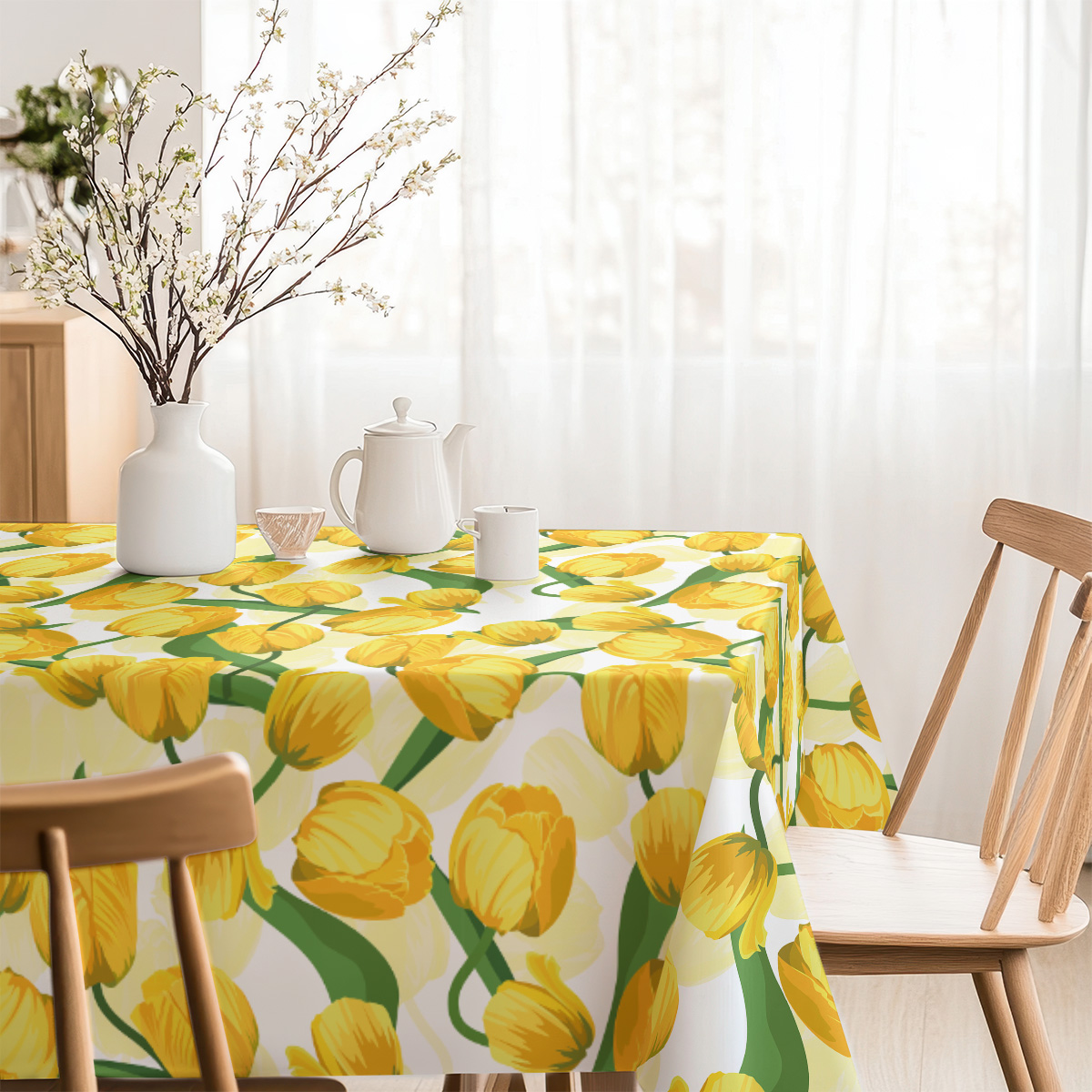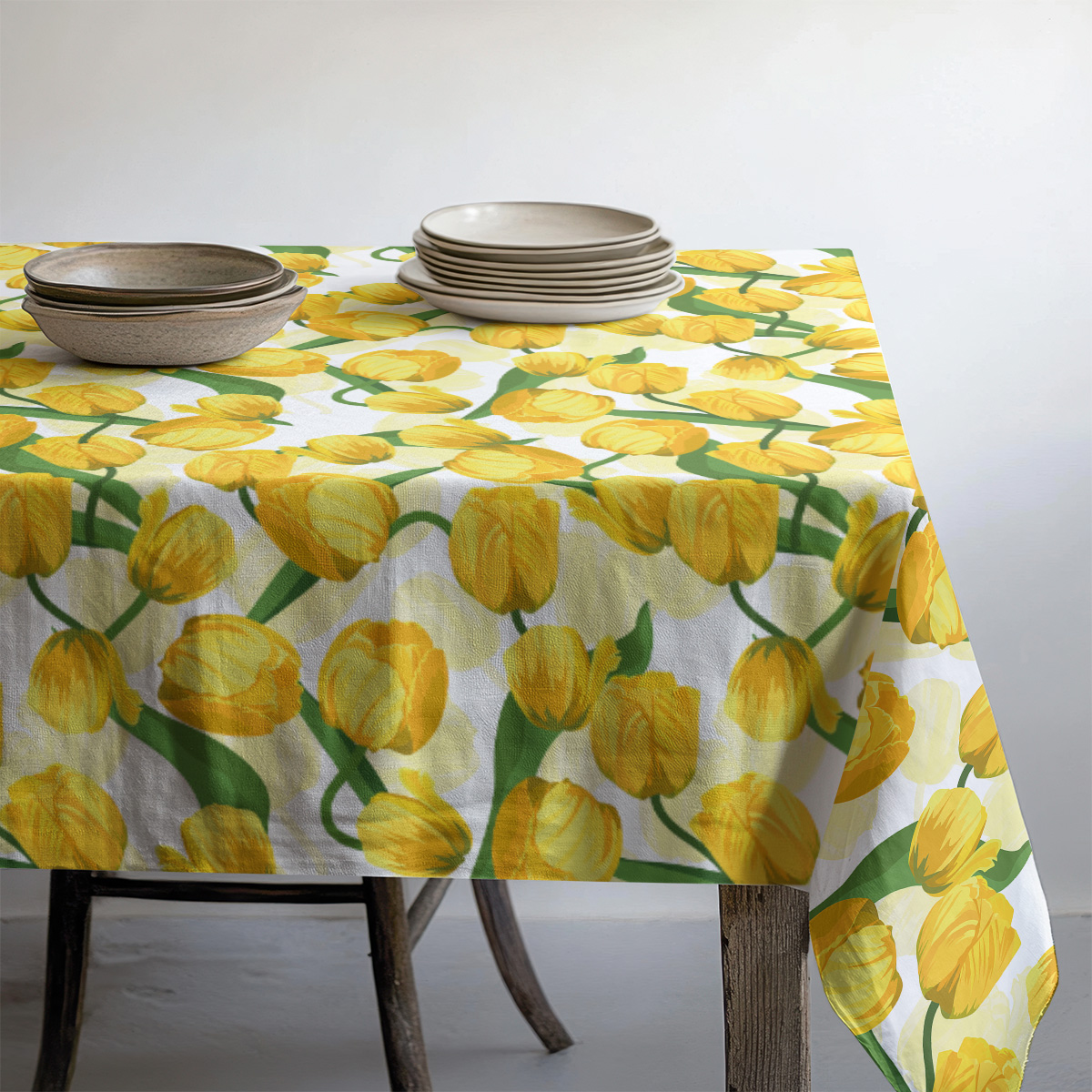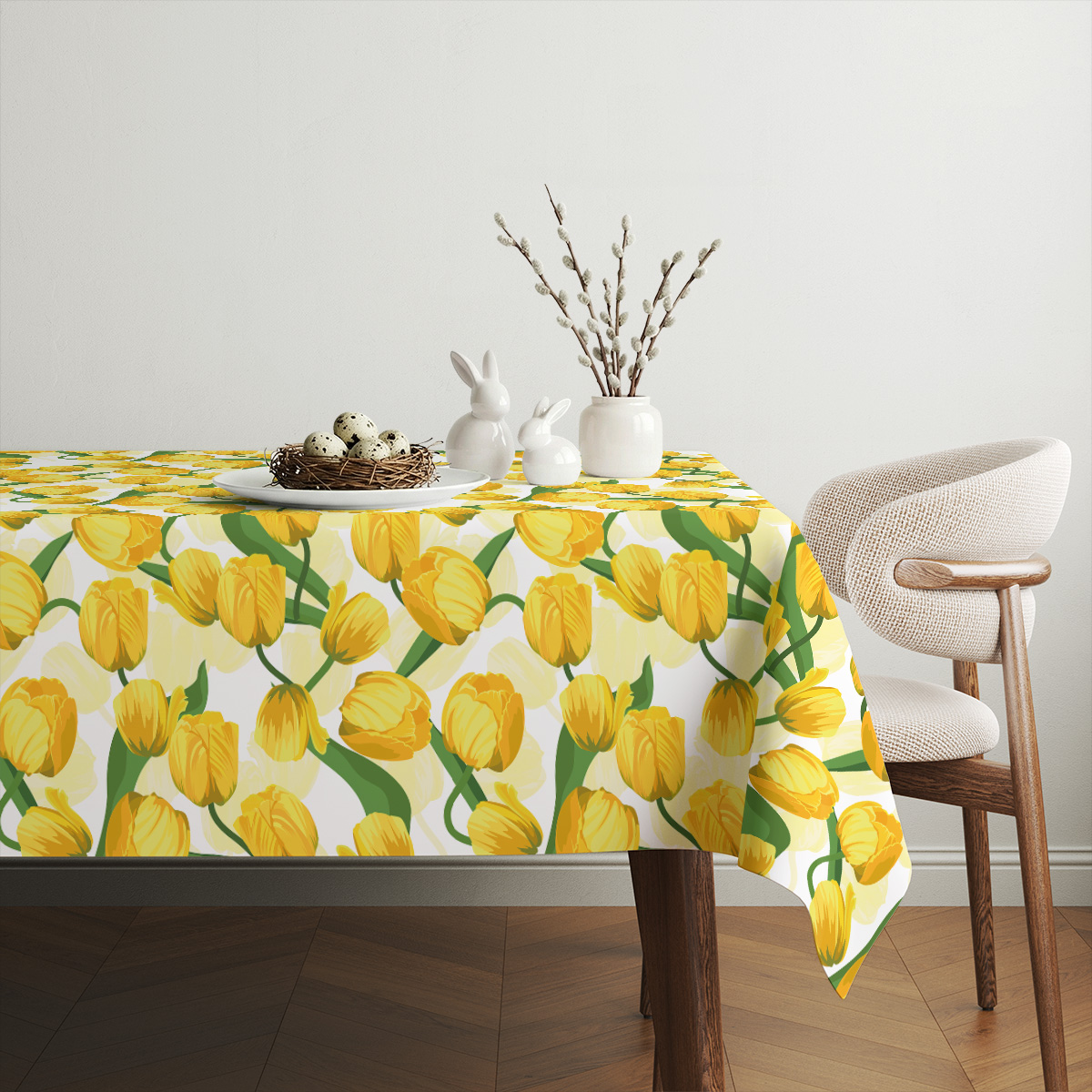 Słoneczny obrus z motywem żółtych tulipanów doda wiosennego charakteru każdemu stołowi. Doskonały na świąteczne i codzienne aranżacje, wprowadza radosny akcent do jadalni.
