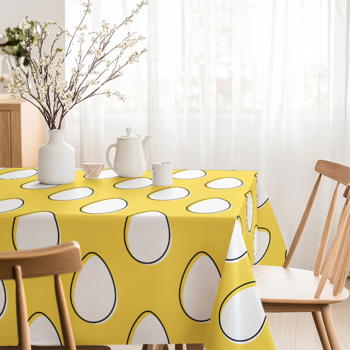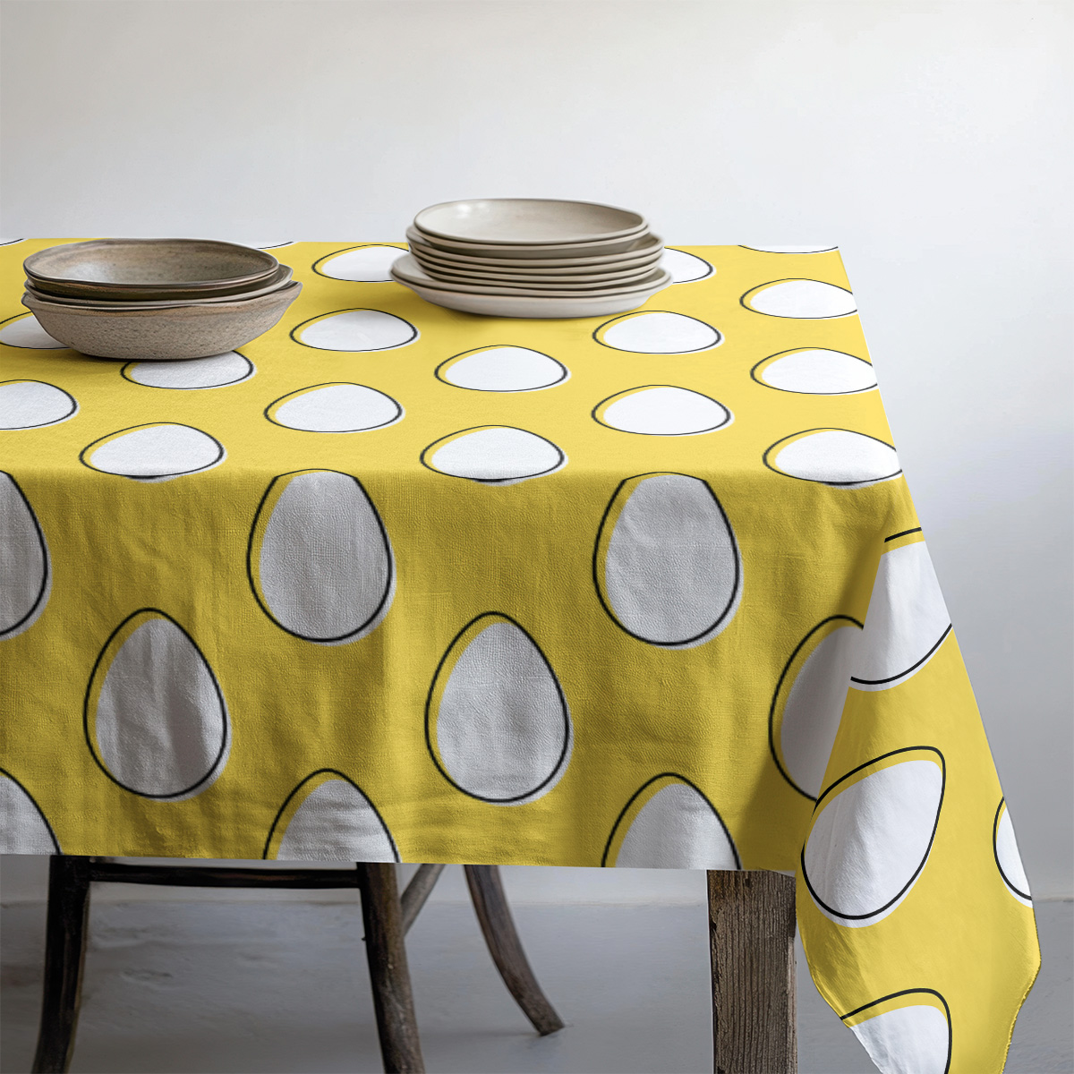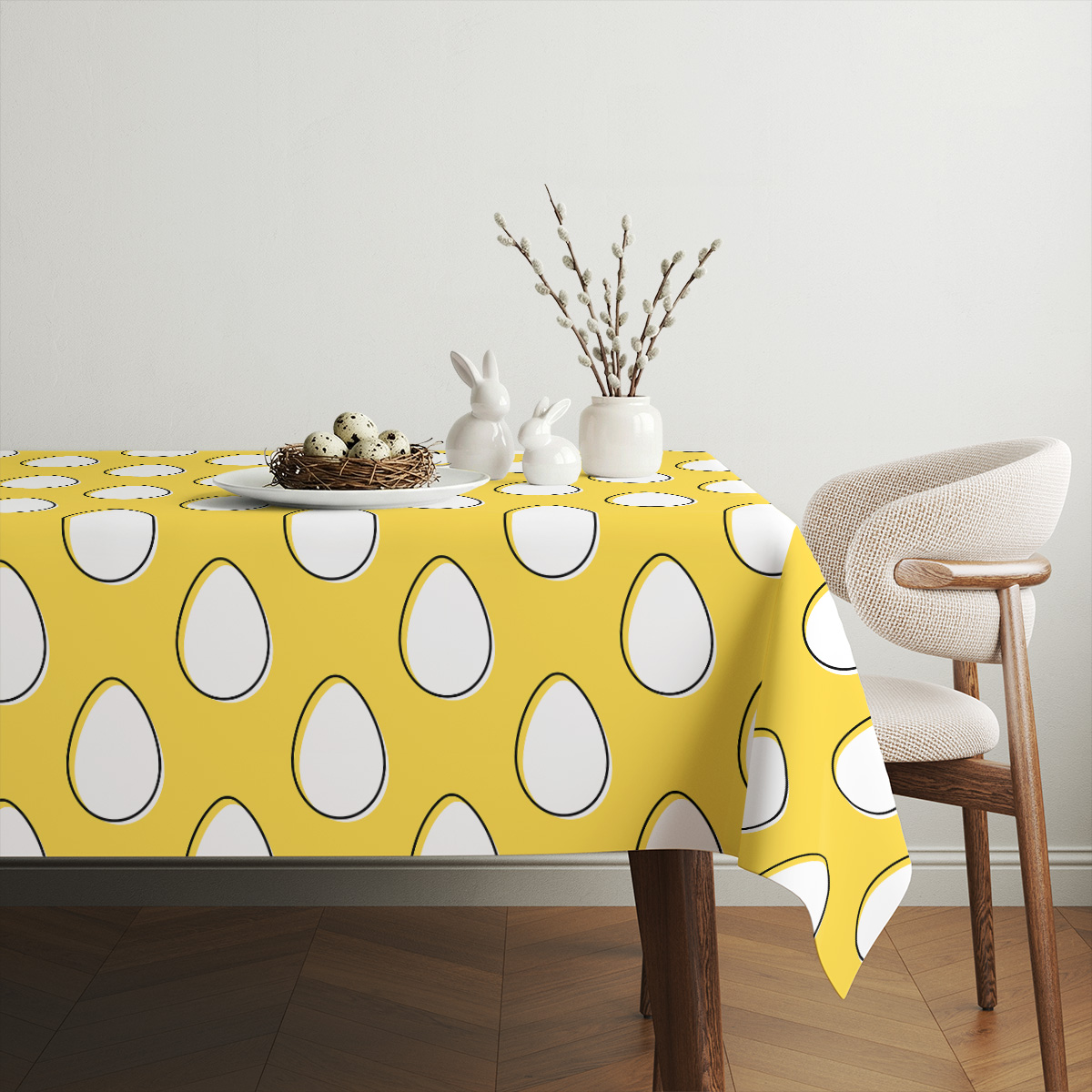 Ten obrus przyciąga wzrok energiczną, słoneczną żółcią i regularnym motywem białych pisanek z subtelną, czarną obwódką.
