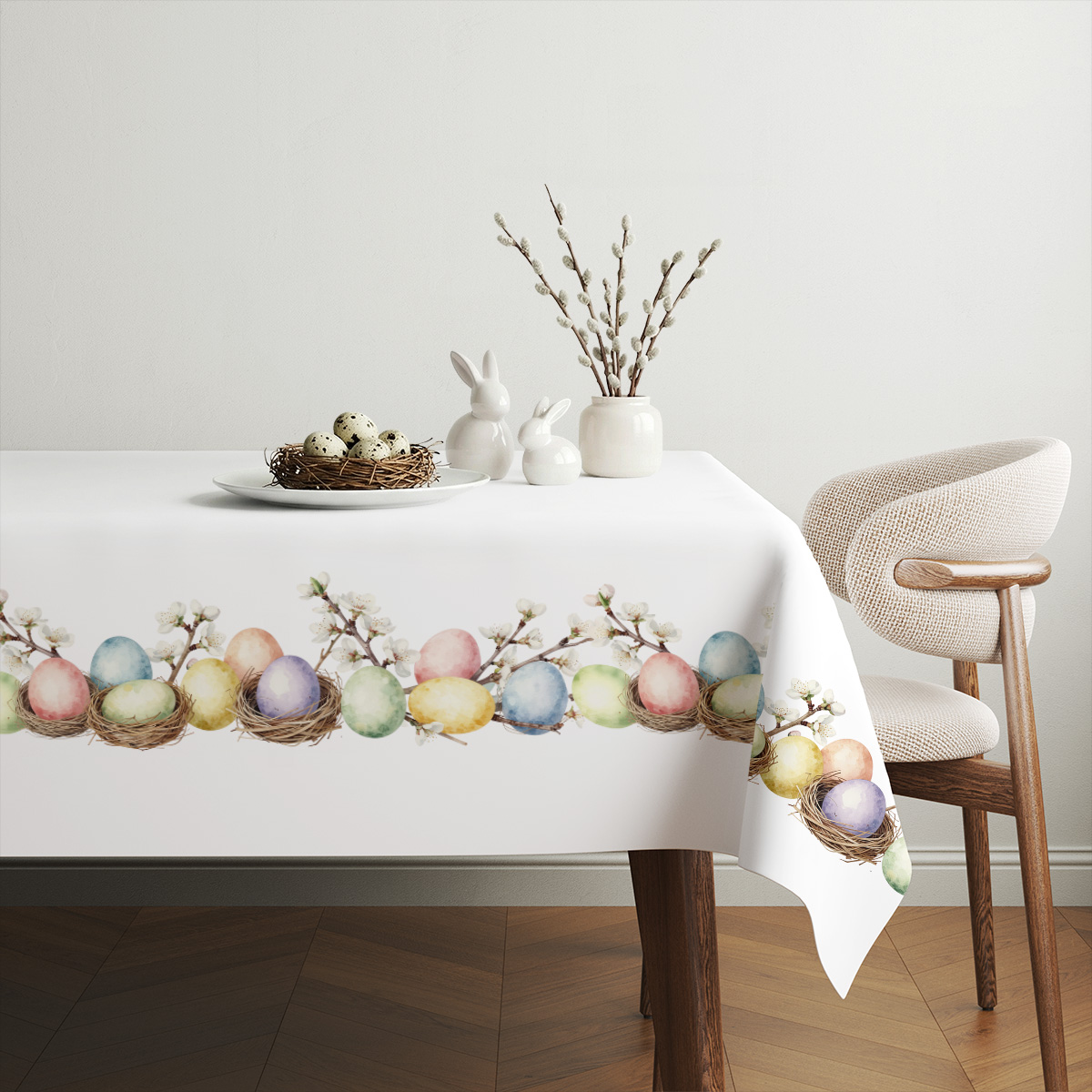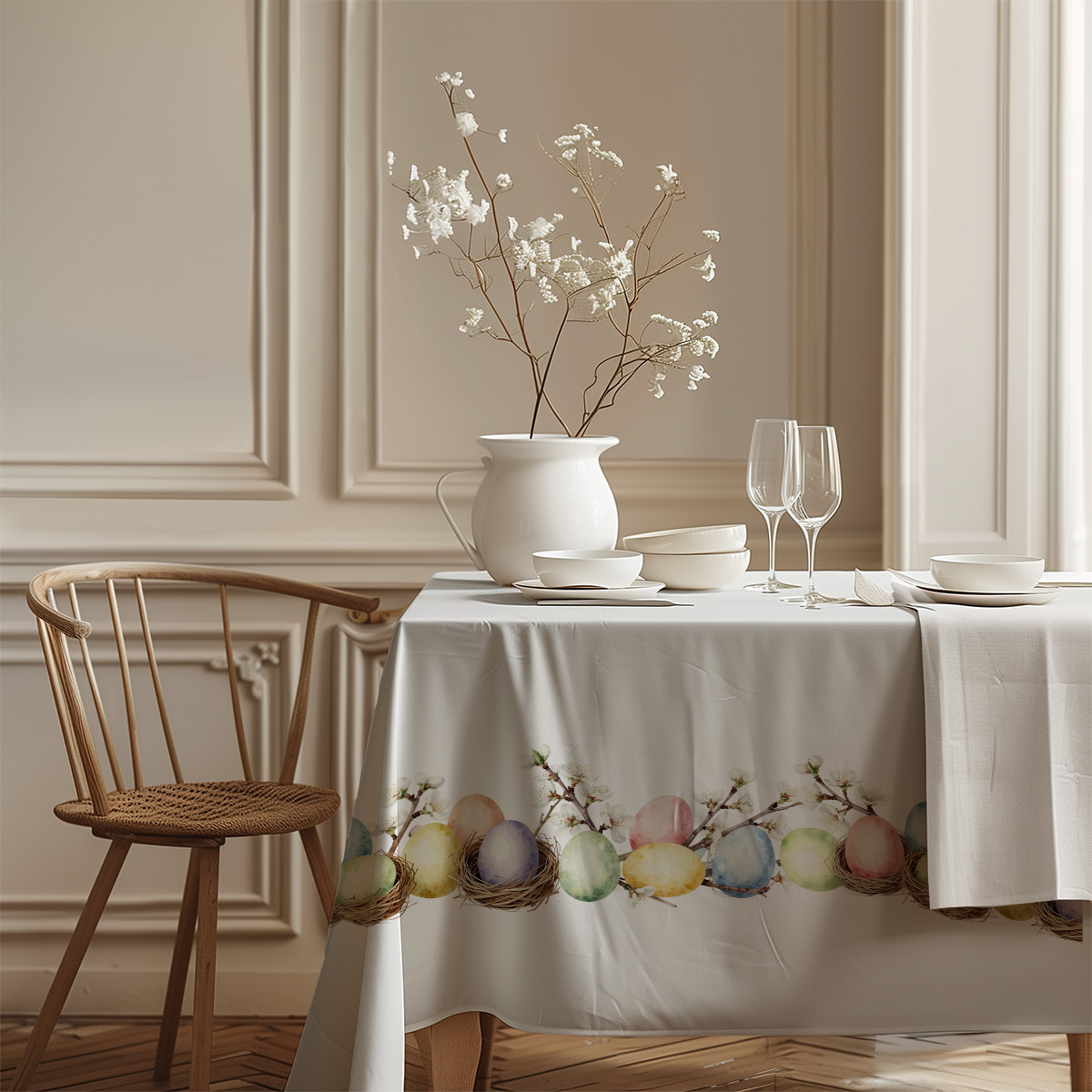 Ten świąteczny obrus ozdobiony jest rzędem pastelowych pisanek w naturalnych gniazdkach oraz subtelnymi, kwitnącymi gałązkami, które wprowadzają do wnętrza lekki, wiosenny nastrój. Neutralne tło podkreśla kolory dekoracji i sprawia, że stół zyskuje elegancki, świąteczny charakter. Tkanina jest plamoodporna i łatwa do czyszczenia, dzięki czemu obrus zachowa świeży wygląd nawet przy intensywnym użytkowaniu.