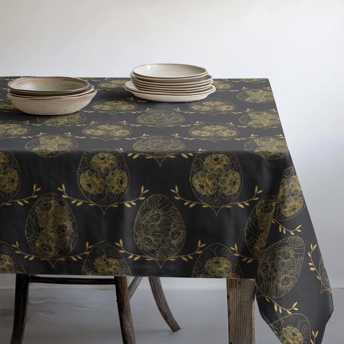 Elegancki obrus z czarnym tłem i złotym, finezyjnym motywem pisanek doda stołowi wyrafinowanego charakteru. Świetnie sprawdzi się podczas świątecznych spotkań, podkreślając dekoracje i porcelanę.