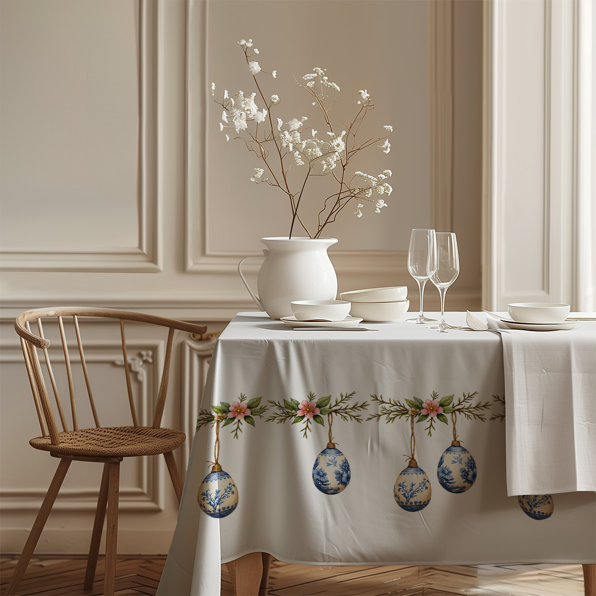 Świąteczny obrus w subtelnym, klasycznym stylu ozdobi stół podczas rodzinnych spotkań. Tkanina jest plamoodporna i łatwa do czyszczenia, a motyw porcelanowych pisanek na gałązkach wnosi elegancję i ciepło.
