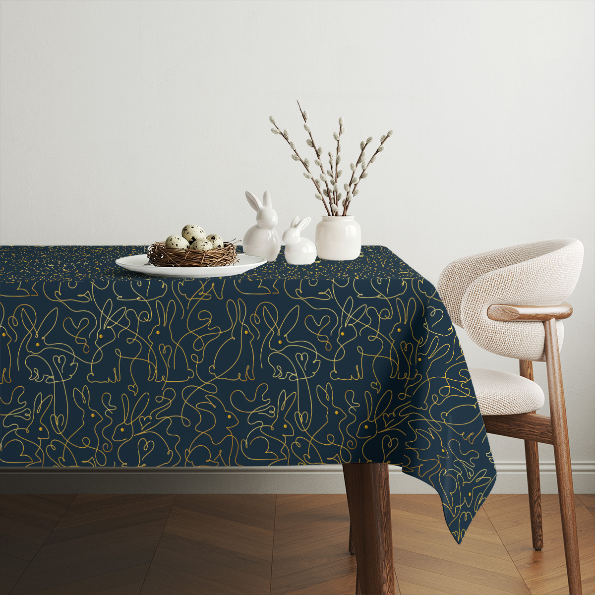 Elegancki obrus w głębokim granacie ozdobiony drobnym, złotym wzorem króliczków doda stołowi świątecznego blasku. Łatwy w pielęgnacji i stylowy, sprawdzi się zarówno podczas uroczystych spotkań, jak i codziennych posiłków.