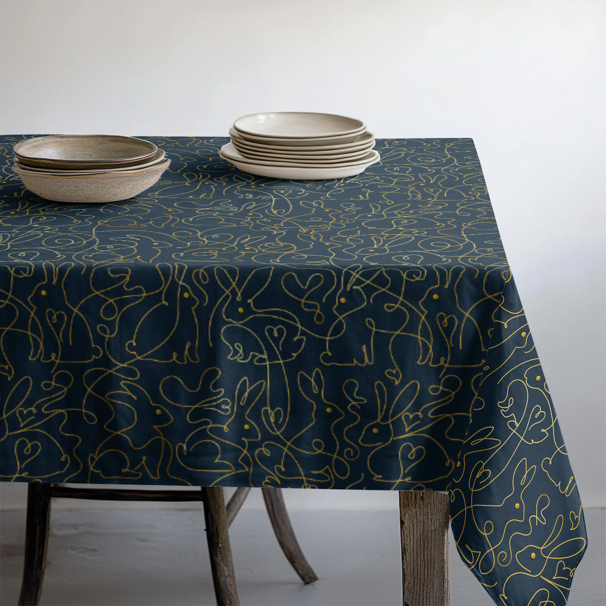 Delikatny wzór powstał z jednej, ciągłej złotej kreski tworzącej sylwetki zajączków na głębokim, granatowym tle. Minimalistyczna grafika wprowadza elegancki, a zarazem lekko zabawny akcent do aranżacji stołu.