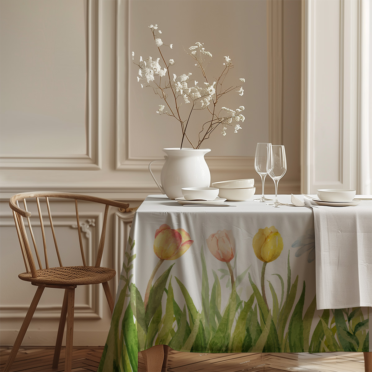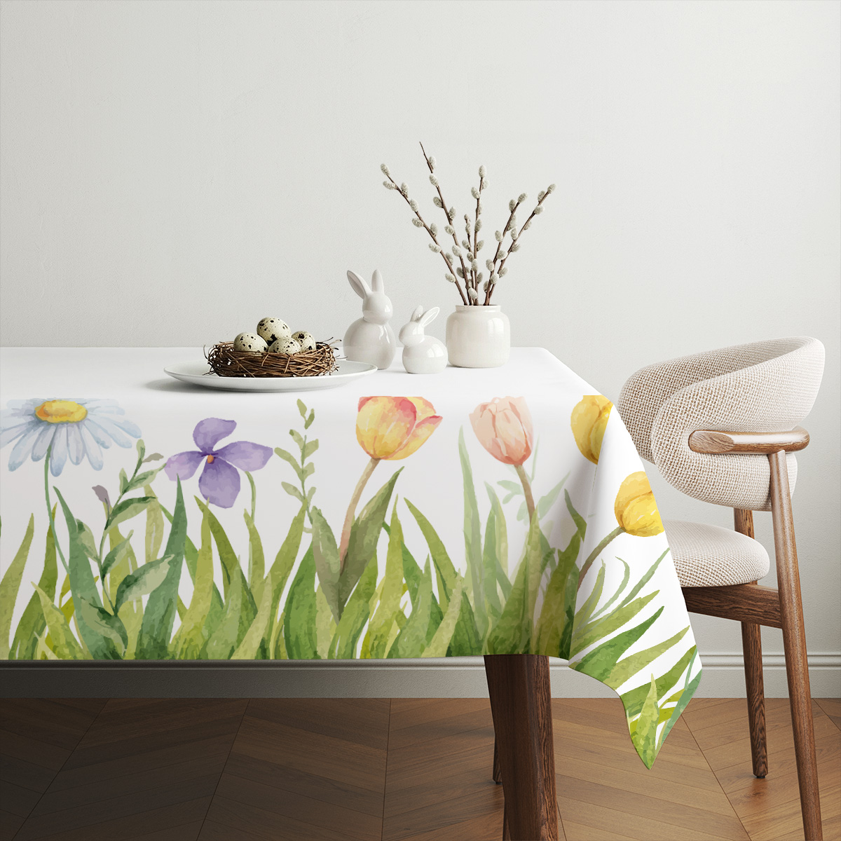 Delikatny obrus z akwarelowym motywem tulipanów i stokrotek doda stołowi wiosennego charakteru. Subtelne kolory i naturalny wzór sprawdzą się podczas świątecznych spotkań i codziennych posiłków.