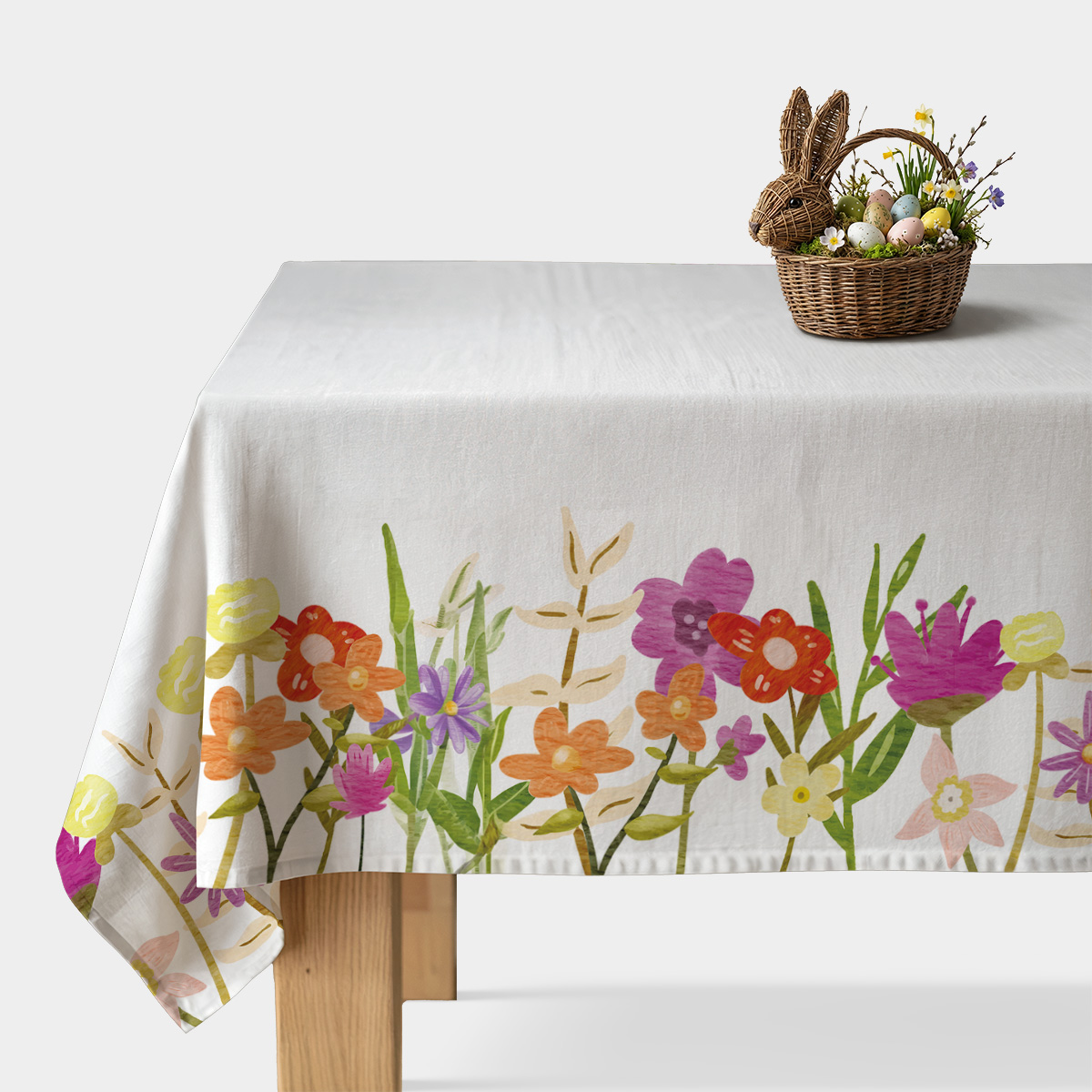 Obrus z malowanym pasem w wiosenne kwiaty doda stołowi świeżości i radosnego charakteru. Kontrastujący czarny środek oraz kolorowy brzeg pięknie podkreślą wielkanocne dekoracje i rodzinne spotkania.