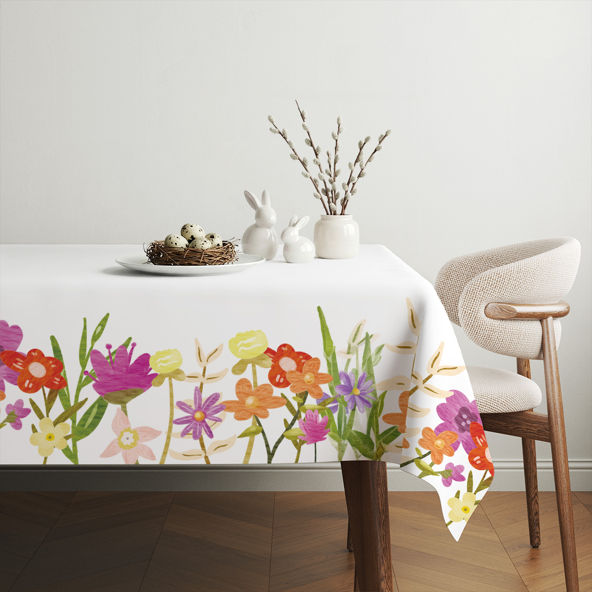 Polecamy zestawić obrus z naturalnymi dodatkami — drewnianymi tacami, ceramicznymi zającami i pastelowymi serwetkami — aby stworzyć przytulną, świąteczną aranżację. Subtelne, kolorowe kwiaty ożywią stół bez przytłaczania wnętrza.