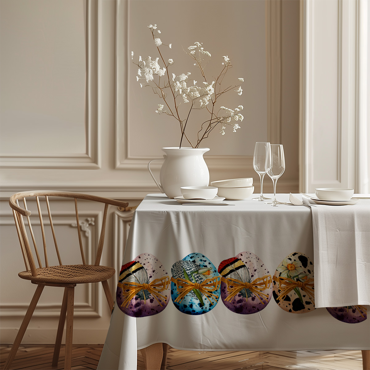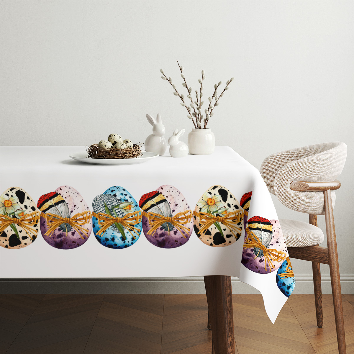 Obrus ozdobiony powtarzalnym motywem ręcznie malowanych pisanek tworzy dekoracyjny pas wzdłuż krawędzi tkaniny. Każde jajko zdobią akwarelowe plamy, drobne kwiaty i kokardki ze słomy, co nadaje projektowi lekko rustykalny charakter.
