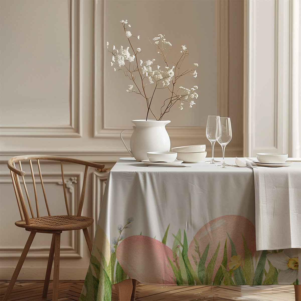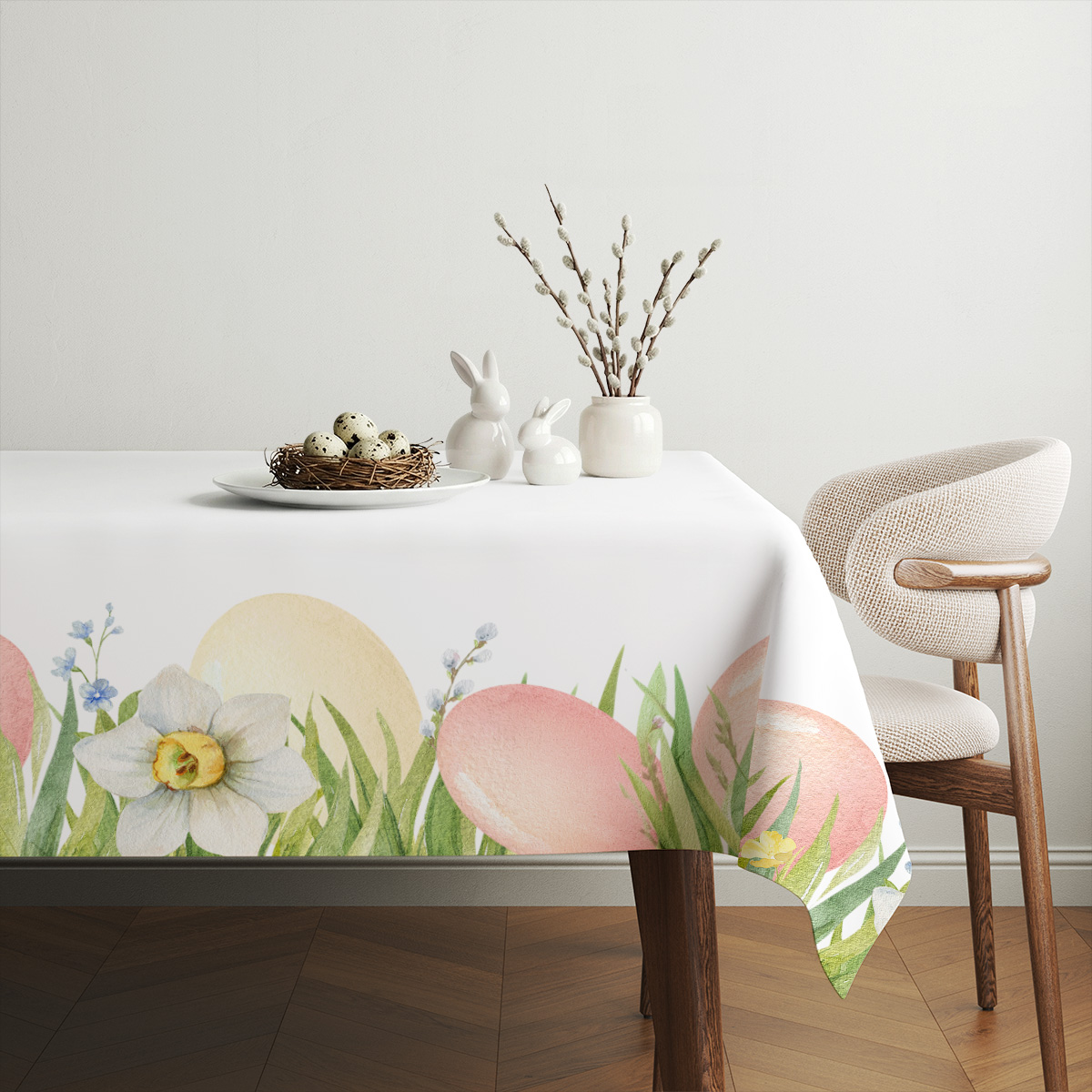 Delikatny obrus ozdobiony akwarelowymi pisankami i wiosennymi kwiatami doda stołowi lekkości. Idealny na świąteczne spotkania i codzienne dekoracje w jasnych, pastelowych wnętrzach.