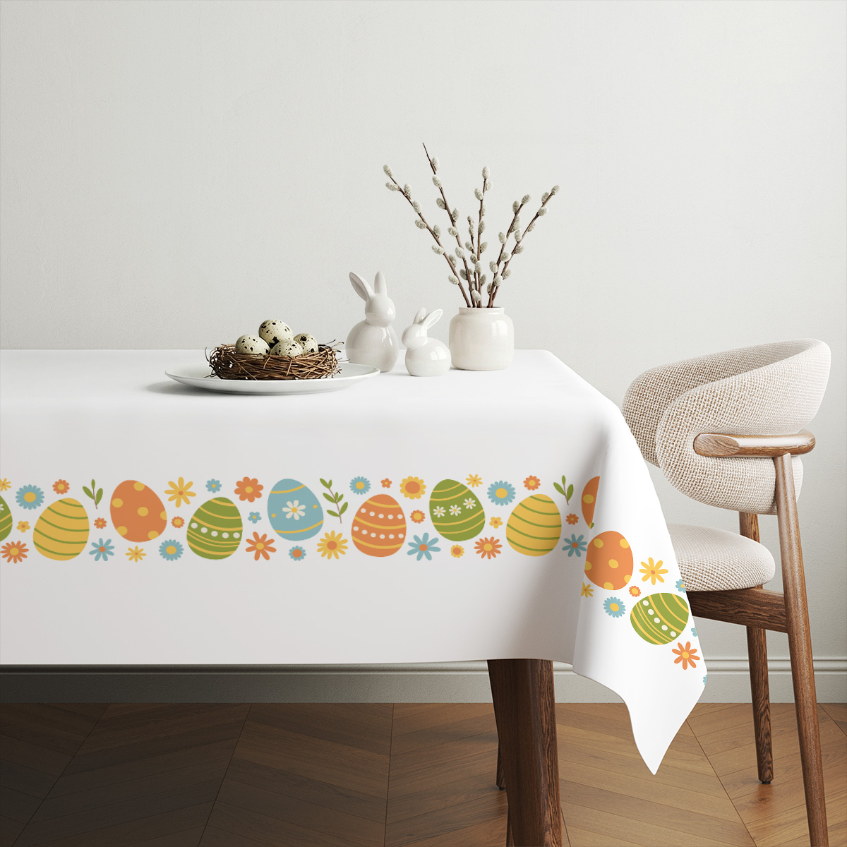 Ten obrus łączy prostotę białego tła z dekoracyjnym paskiem w pastelowych kolorach, gdzie poukładane są kolorowe pisanki i drobne kwiatuszki. Wzór jest lekki i pogodny, dzięki czemu wnosi do wnętrza atmosferę świątecznej radości bez nadmiaru ozdób.