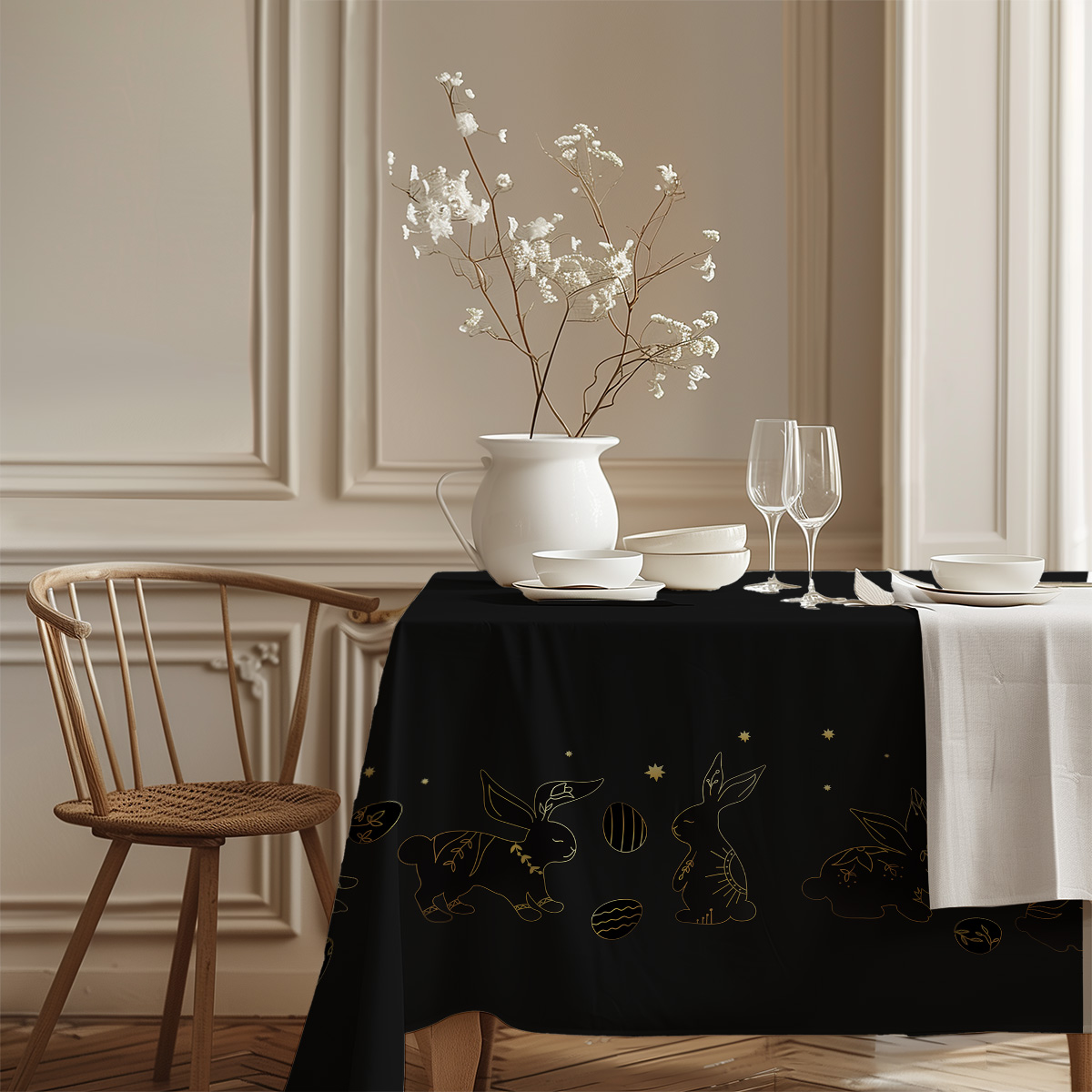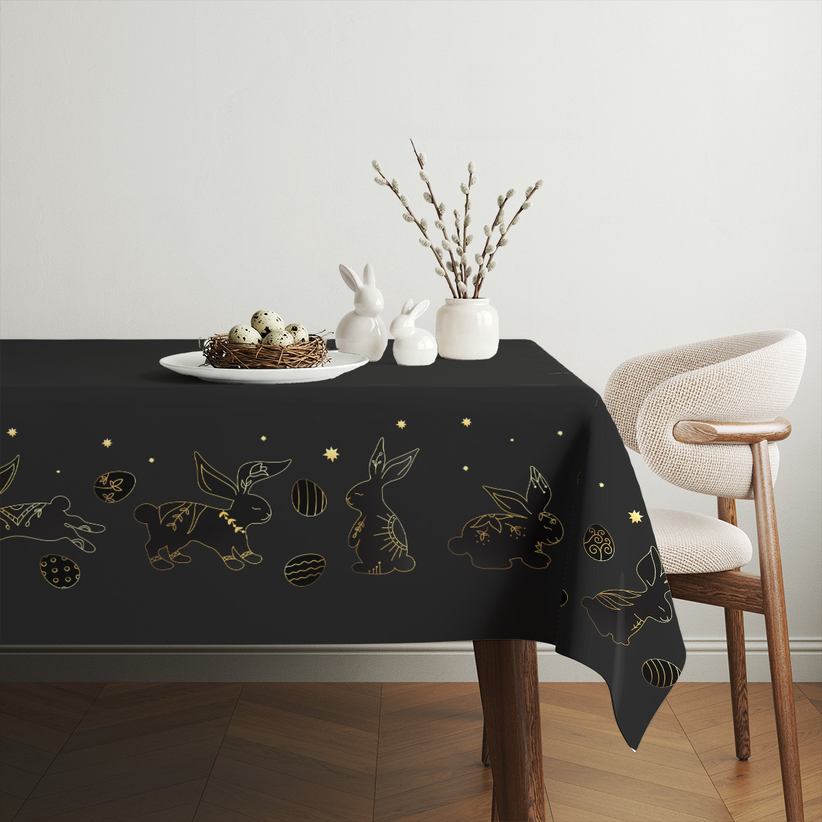 Czarny obrus ozdobiony delikatnymi, złotymi konturami zajączków i pisanek tworzy elegancką, a zarazem lekką kompozycję. Subtelny motyw w złotej linii dodaje wnętrzu świątecznego blasku bez przesadnej dekoracyjności.